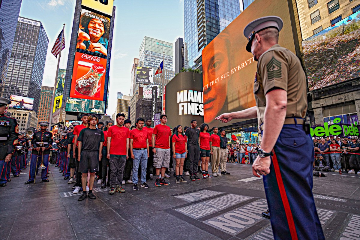 The NYPD and Marines celebrated Fleet Week in Times Square on Wednesday night by treating youngsters to a special show by the armed forces and distributing boxing gloves to youth athletes in an effort keep them motivated.Photo by Dean MosesThe tweens and teens of Cops and Kids Boxing — a Brooklyn based free gym program helmed by the NYPD boxing team — were provided with a front row experience to the show for fleet week.Photo by Dean Moses