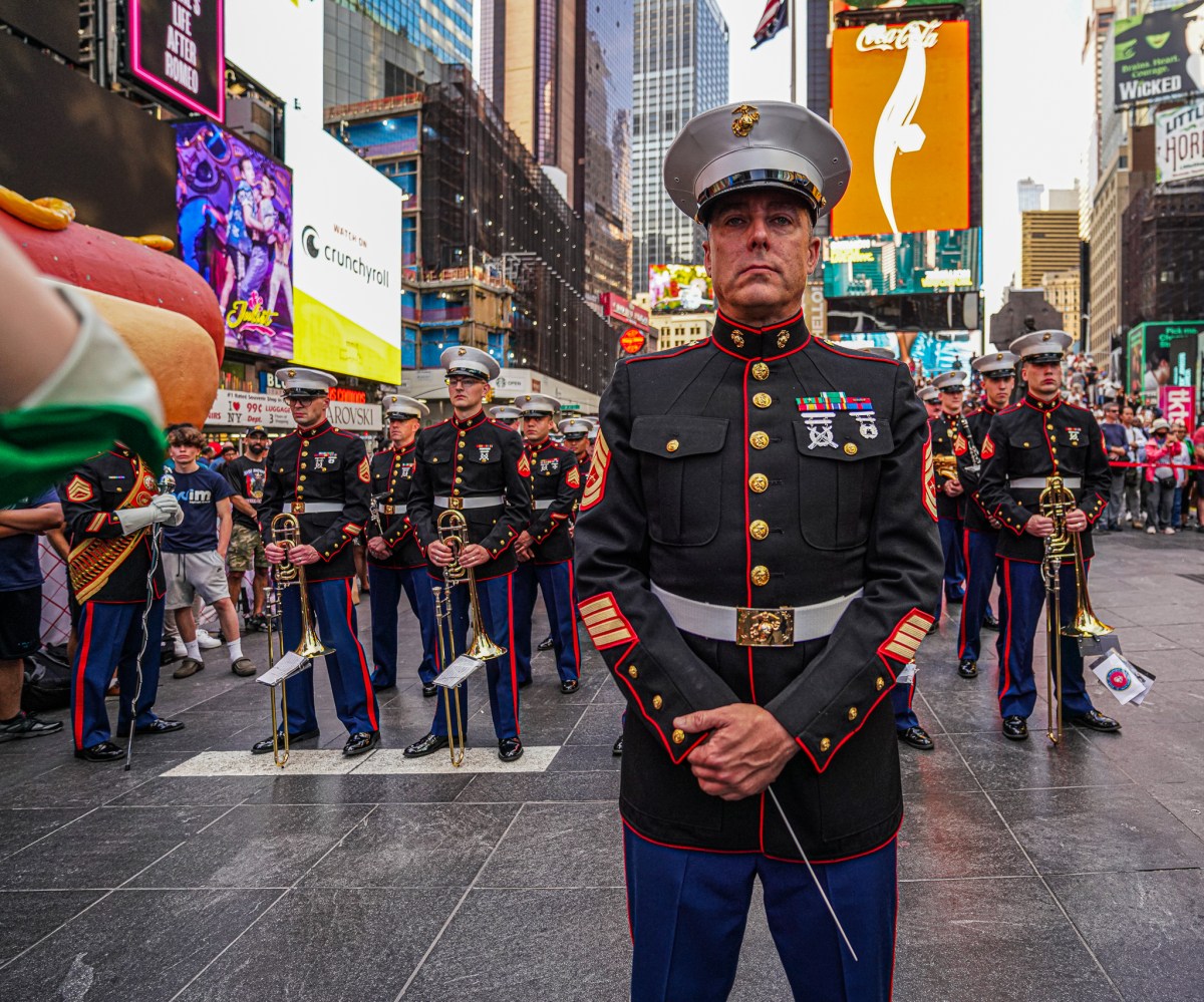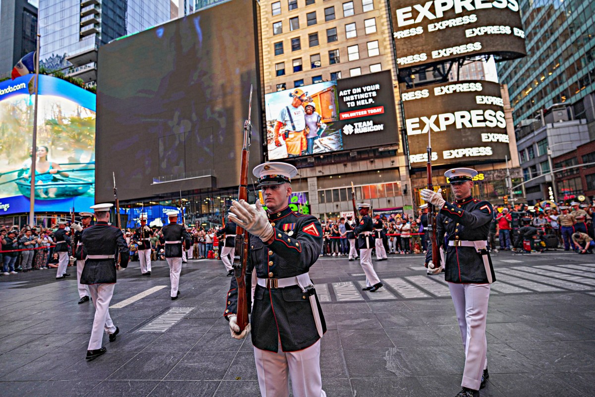 Hundreds of tourists and New Yorkers alike gathered in Father Duffy Square to watch members of the Armed Forces assemble in formation, play music and demonstrate their skills through a unique display of military training that saw the Marines twirling their firearms in midair. Kicking off Fleet Week, the presentation had many looking on in awe, including youngsters who are currently being mentored by a police program.