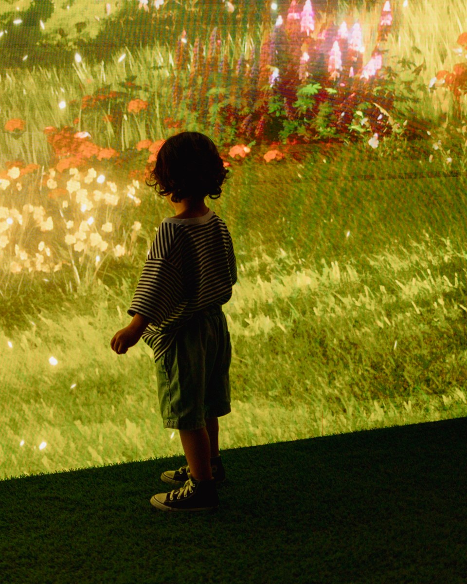 Walking into the installation, visitors are instantly met by a vast screen that shows a landscape without a single skyscraper. One walks along a patch of turf and feels as if they’re prancing through a peaceful park flowing with flora. Not to mention, the space’s aroma is similar to the naturality it highlights—not like the smelly city sidewalks that replaced it.