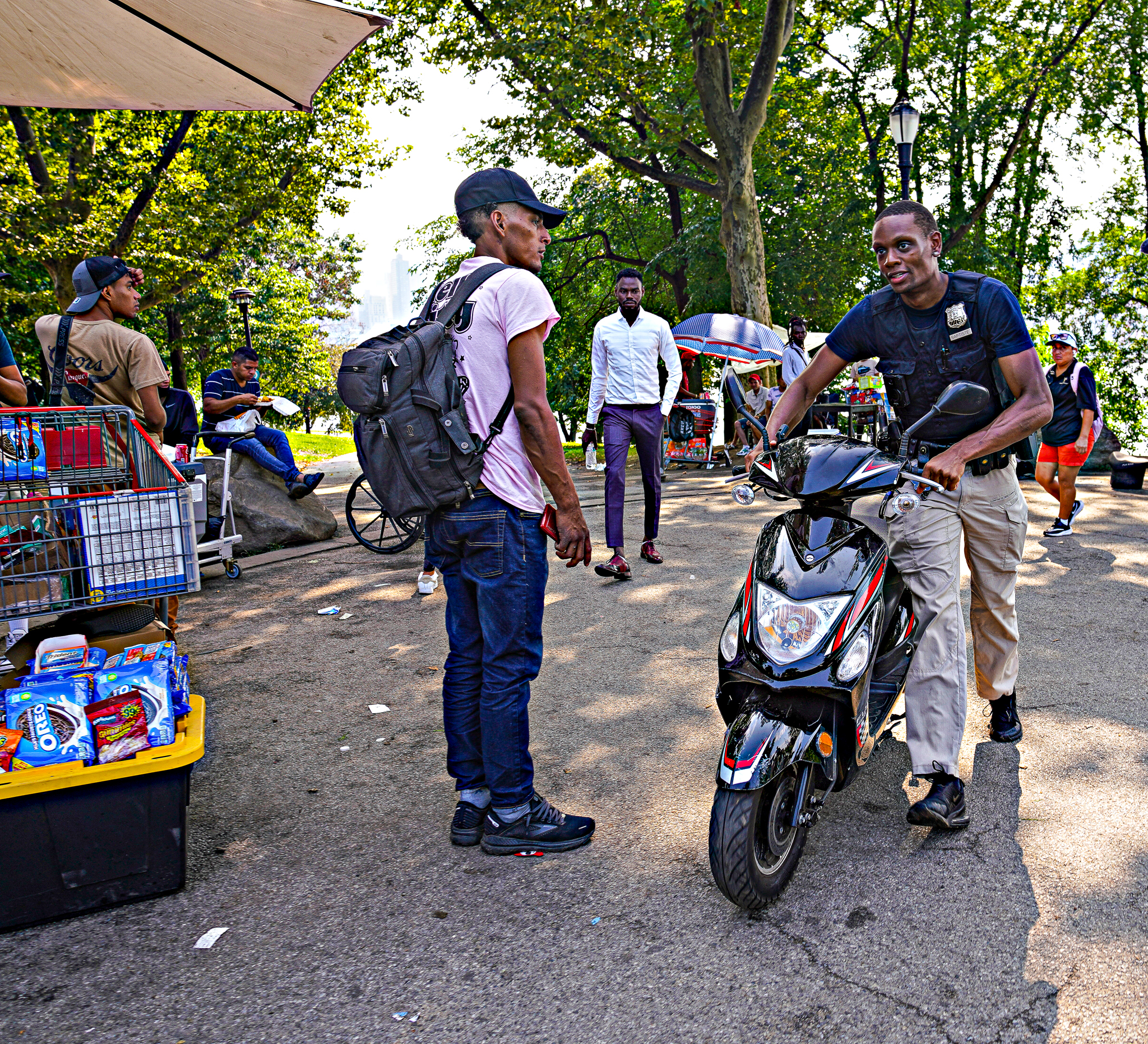 Police brass could be observed overseeing an army of cops wheeling moped after moped out of the tent city. Asylum-seekers watched on, some with intrigue, others in anger —and then some paid little attention to the entire situation as they lounged on the grass getting their hair cut. Police moved several new arrivals back as they brought in tow trucks with confiscated vehicles hooked to them.