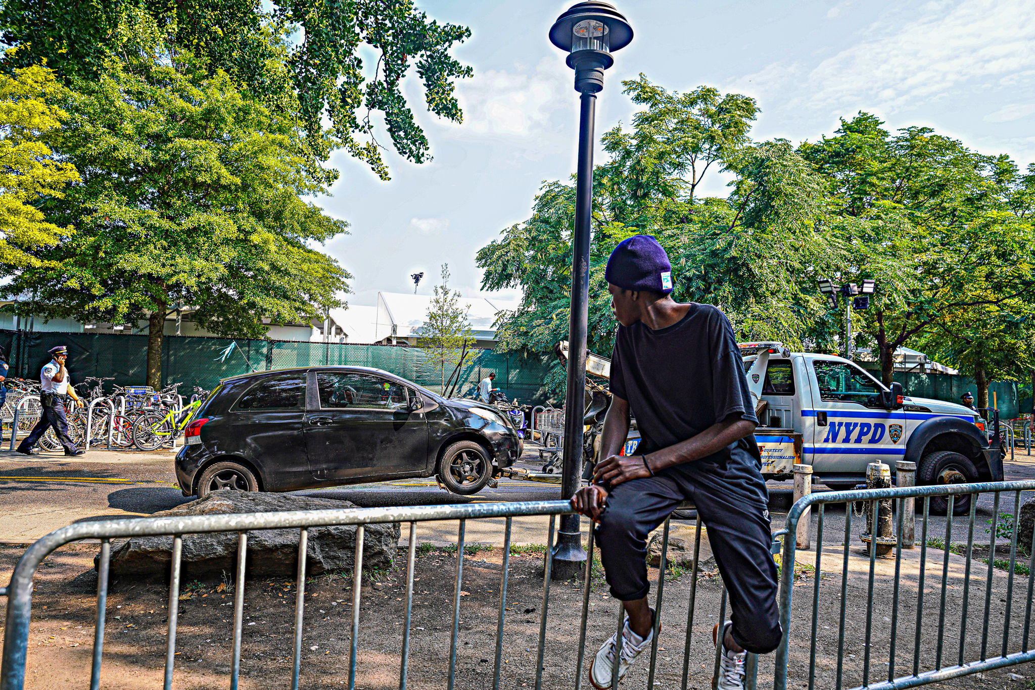 The NYPD performed a massive operation at the Randall’s Island migrant shelter Monday evening removing dozens of stolen and unregistered vehicles hours after a triple shooting left one dead.