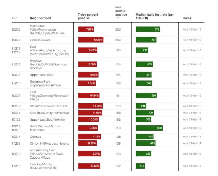 Manhattan also has 12 of the 15 New York City neighborhoods with the highest 7-day positivity rate between April 13-19, with Lincoln Square’s 12.96% having the second-highest rate overall.