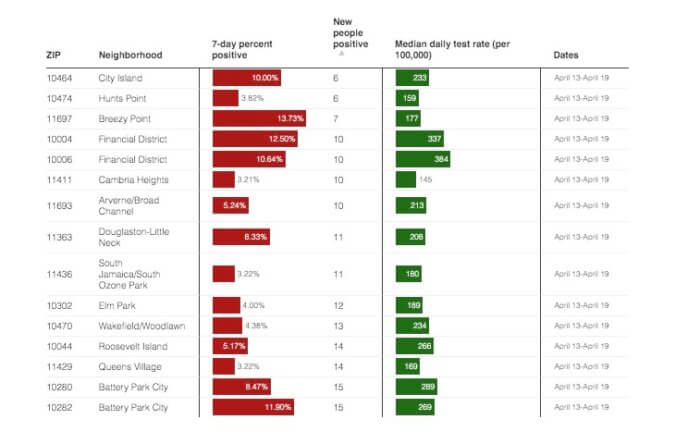 The Bronx neighborhoods were City Island (10464, 6 new cases, 10% positivity rate) and Hunts Point (10474, 6 new cases, 3.82% positivity rate).