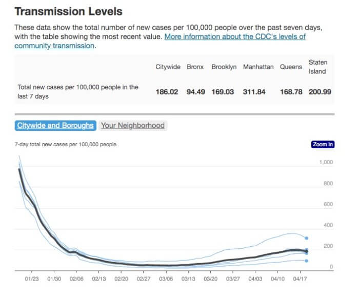 Manhattan continues to have the highest citywide transmission rate, at 311.84 cases per 100,000 residents — well above the citywide average of 186.02 cases per 100,000. Staten Island’s transmission rate has grown higher in the last six days — from 182.51 back on April 19 to 200.99 on April 24.