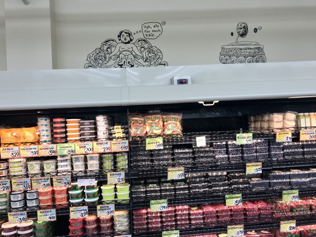 The new East Village location will also feature local art, by illustrator Peter Arkle, who has lived in the East Village since 2002. Over 180 illustrations appear on the store’s walls, each an image or sculpture or other work of art that Arkle observed in the neighborhood. Each image is numbered and a map near the entrance shows the location of each object in the neighborhood.