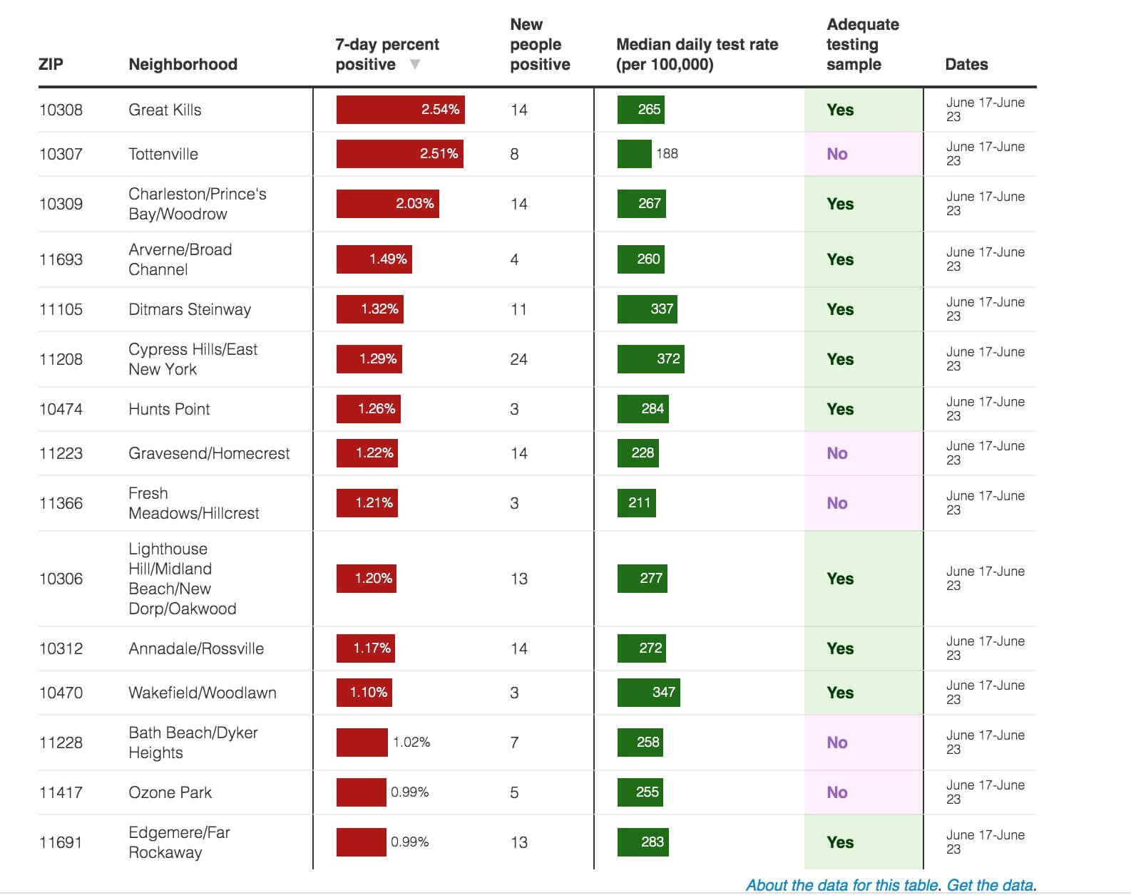 Just three areas of the five boroughs registered a 7-day positivity rate exceeding 2% between June 17-23. All three locations are on Staten Island: Great Kills (ZIP 10308, 2.54% 7-day positivity rate); Tottenville (10307, 2.51%) and Charleston/Prince’s Bay/Woodrow (10309, 2.03%). But none of these areas had more than 14 new COVID-19 cases each.