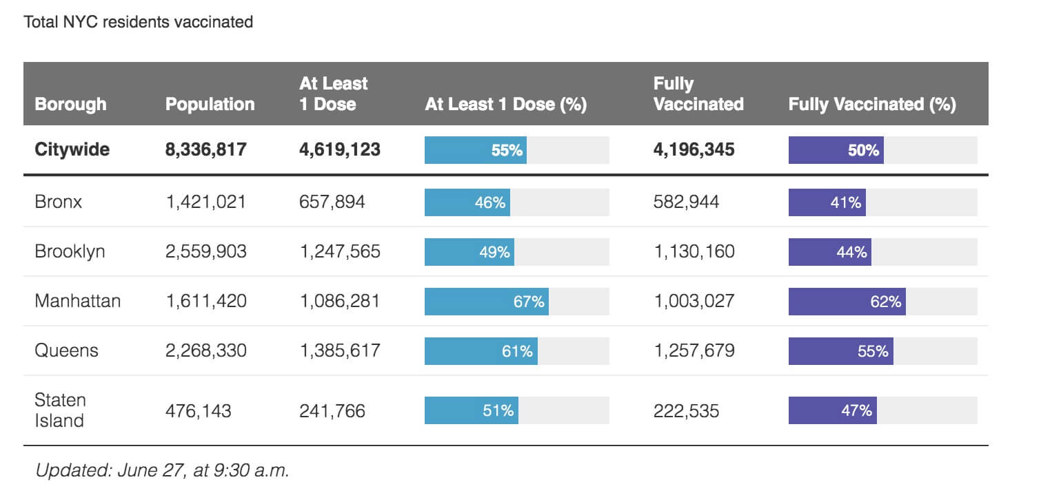 Manhattan continues to lead the way both in number of residents with at least one dose (67%) and those who are fully vaccinated (62%). Queens is second with 61% with at least one dose and 57% fully vaccinated.