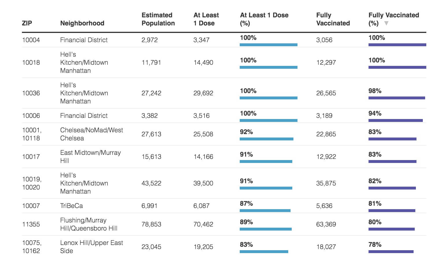 Manhattan neighborhoods also continue to have the highest fully vaccinated rates in the city. One area of the Financial District (10004) and Hell’s Kitchen/Midtown Manhattan (10018) remain the only communities in New York City with a perfect fully vaccinated rate of 100%.