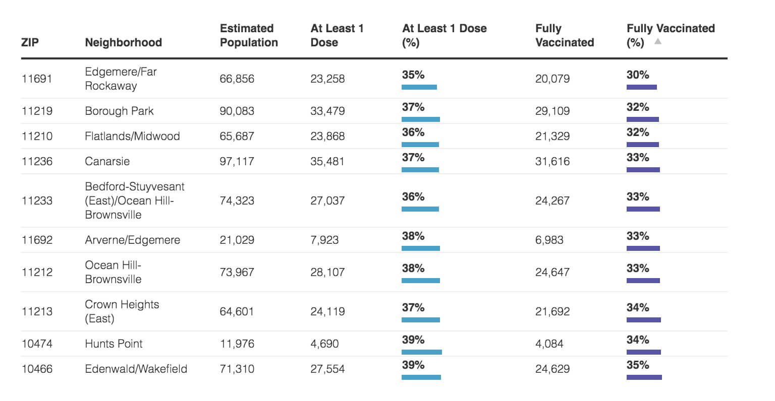 The needle has barely moved when it comes to the vaccination effort in Edgemere/Far Rockaway, Queens (11691), which continues to have the weakest rates at 35% of the population with at least one dose and 31% fully vaccinated.