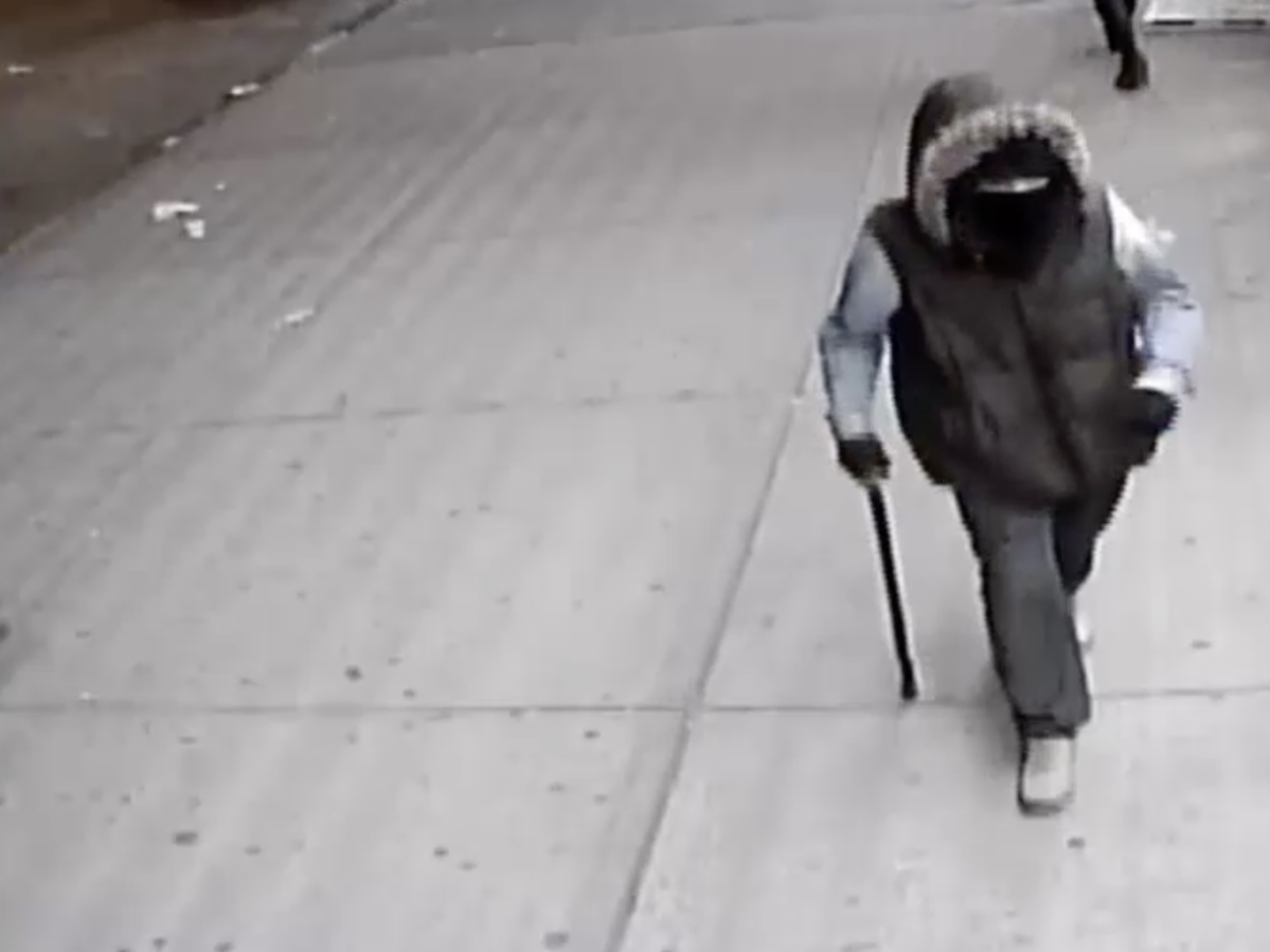 The footage police released on Feb. 16 shows the suspect walking nearby, dressed in a dark-colored winter jacket with a fur collar while wearing a ski mask over his face. He also dark gloves, charcoal gray pants and light-colored shoes while walking with a cane.