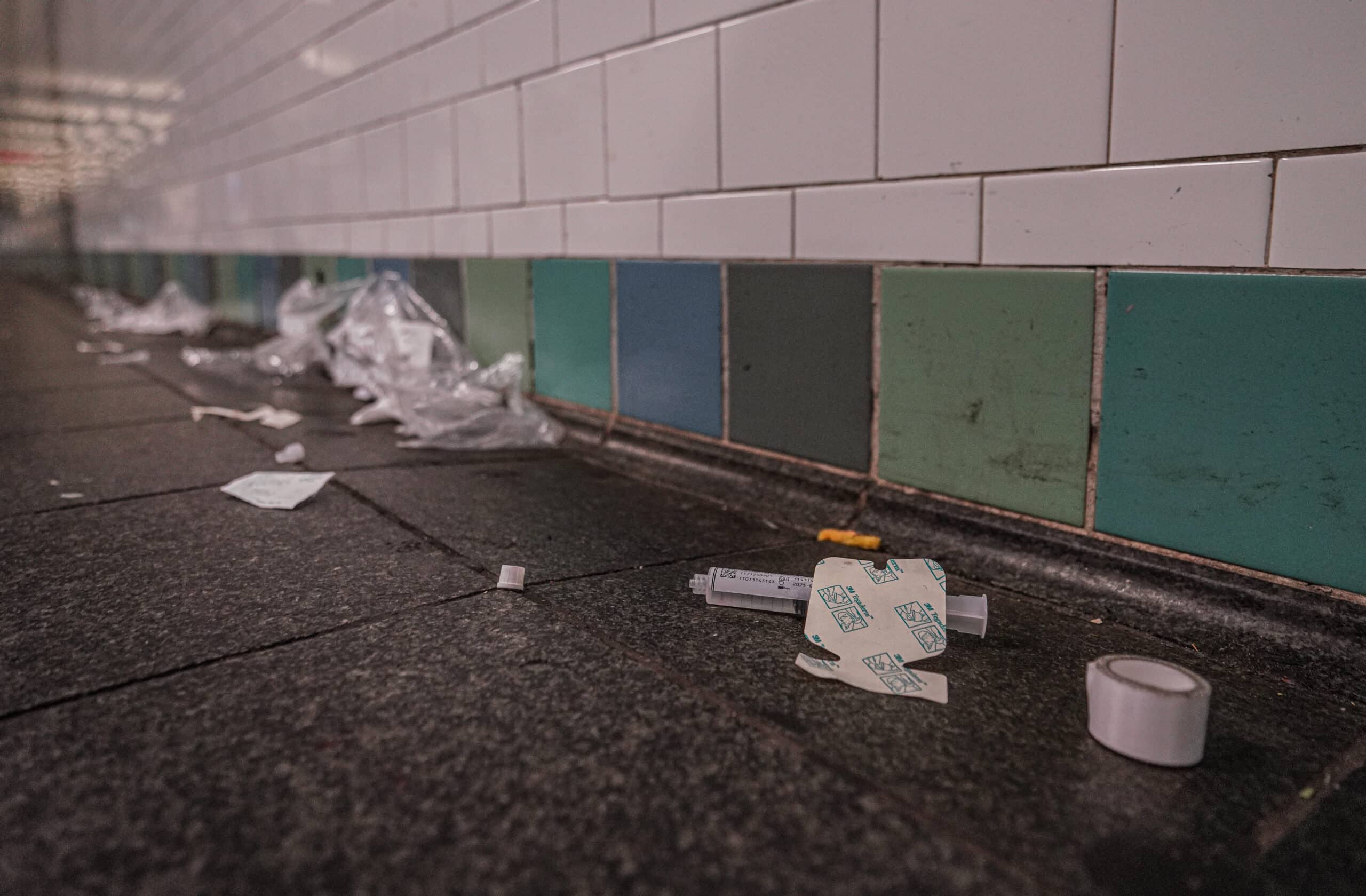 Hours after the attack, discarded medical debris remained on the scene — serving as a reminder of the violent assault in one of the city’s busiest transit hubs.