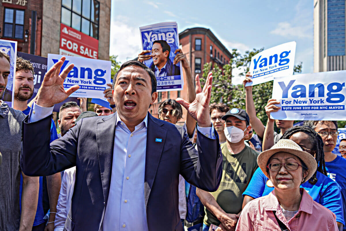 Andrew Yang stood encircled by chanting, hyped-up supporters on Kimlau Square in Chinatown on June 21, telling members of the press and potential voters that today is akin the final moment of a basketball game.