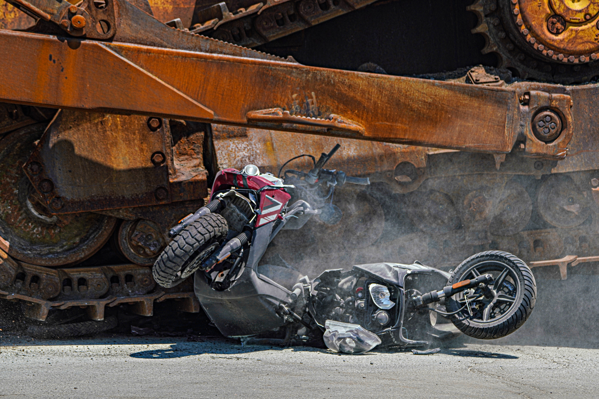 After the speech, Tisch and Adams watched on as two bulldozers crumpled, crushed, and violently chewed up the two-wheeled vehicles, sending chunks of debris whirling into the air.