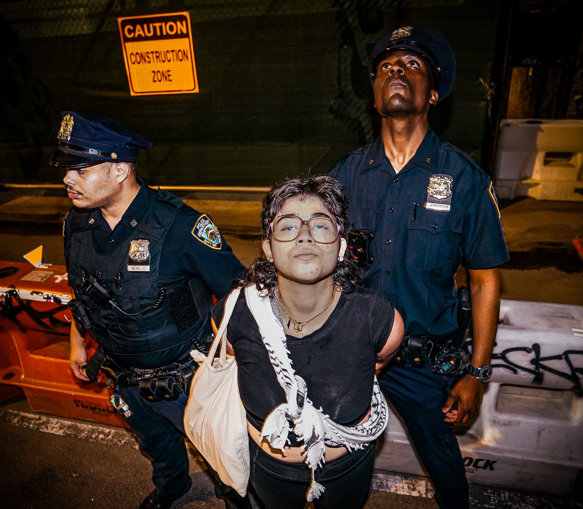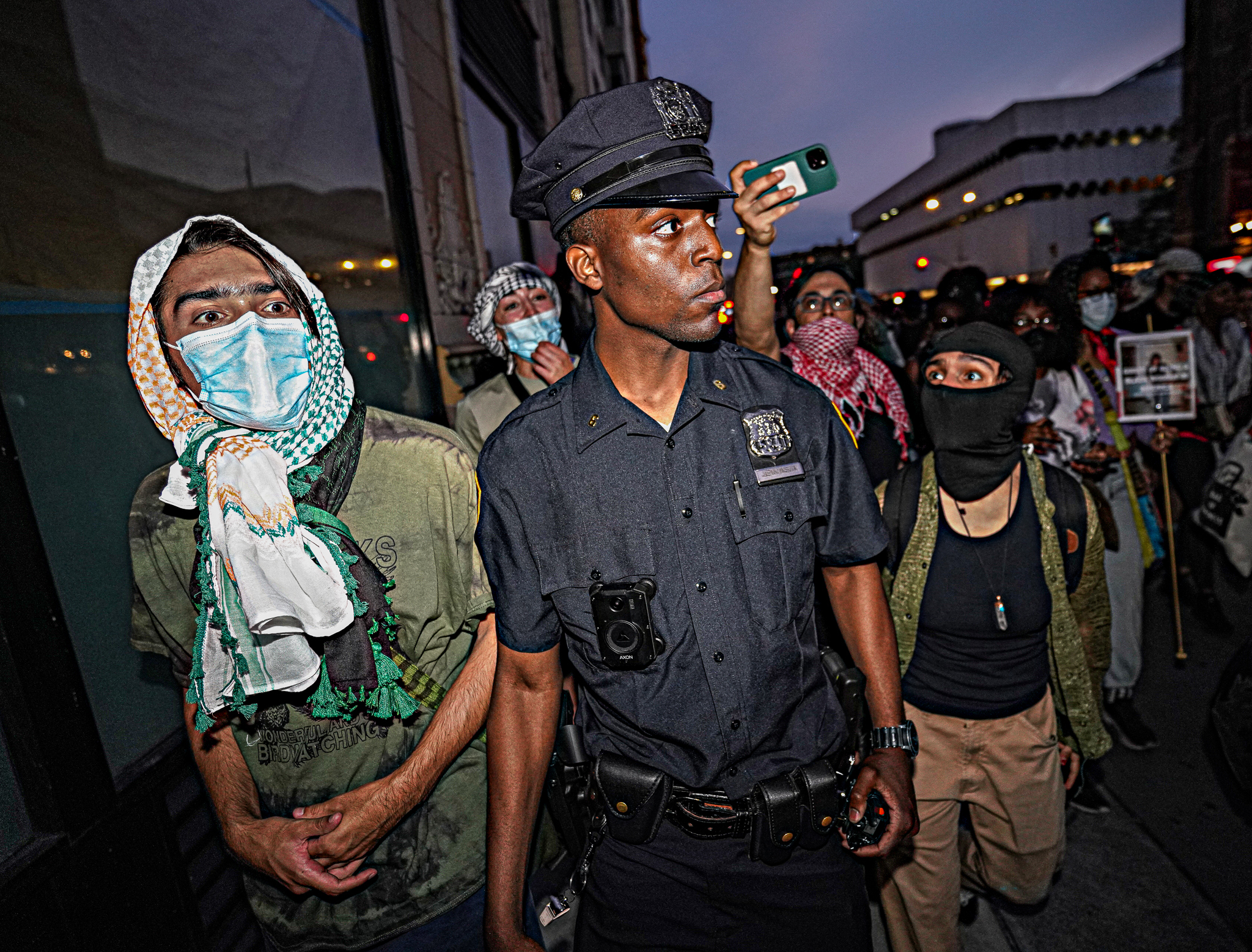 The NYPD told protesters to get to the sidewalk or face arrest. Marchers flirted with danger by stepping in and out of the roadway and cursing at officers. Cops pulled one person from the crowd and cuffed them for unclear reasons, resulting in a shoving match between police and protesters.