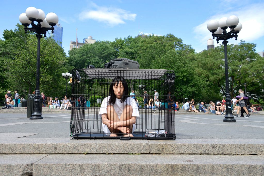 BY BOB KRASNER | Hedy Zhang, a fine-art major at Parsons, started branching out into performance art last year. But it wasn’t until a Saturday a couple of weekends ago that she put herself out into a public space — in a cage. More specifically, a dog crate, in which she sat for 10 hours in Union Square Park performing a silent piece called “Self Imprison.”