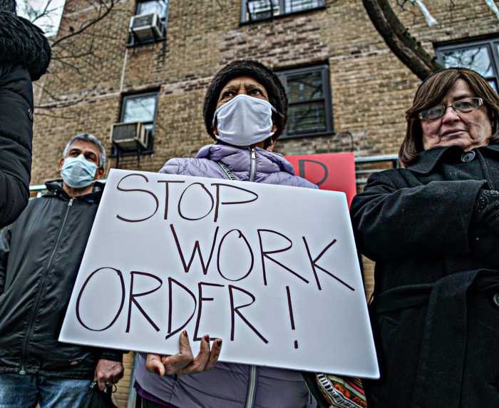 The modest gathering erected parcel boxes with frowns inscribed over them at the foot of 38-50 21st Street in Long Island City. Behind this Jenga tower of boxes, demonstrators gripped banners and waved signs. Amidst this gaggle of activists and sympathetic cohorts, workers who have experienced the woes of the pandemic in the field, toiling while others quarantined spoke about their experiences.