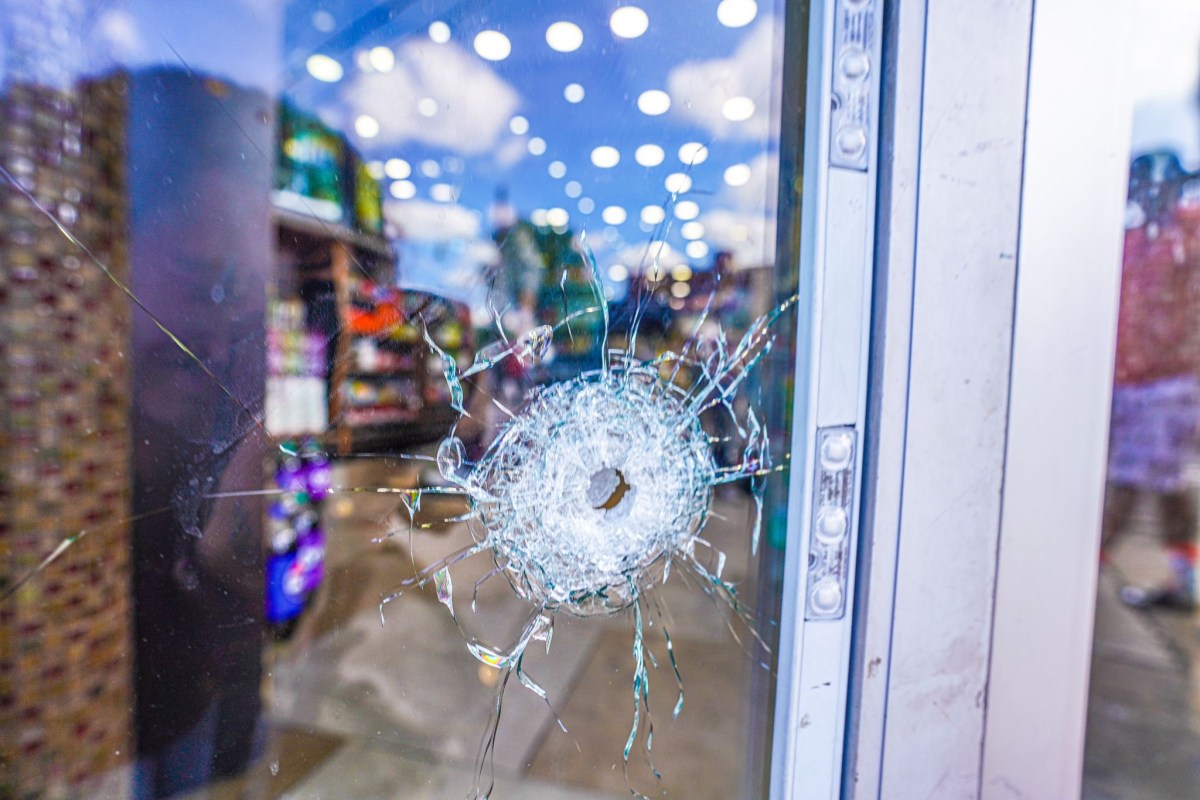 The bodega also didn’t come out unscathed. At least one bullet penetrated the windows of the establishment, leaving a spider web of cracks in its wake.