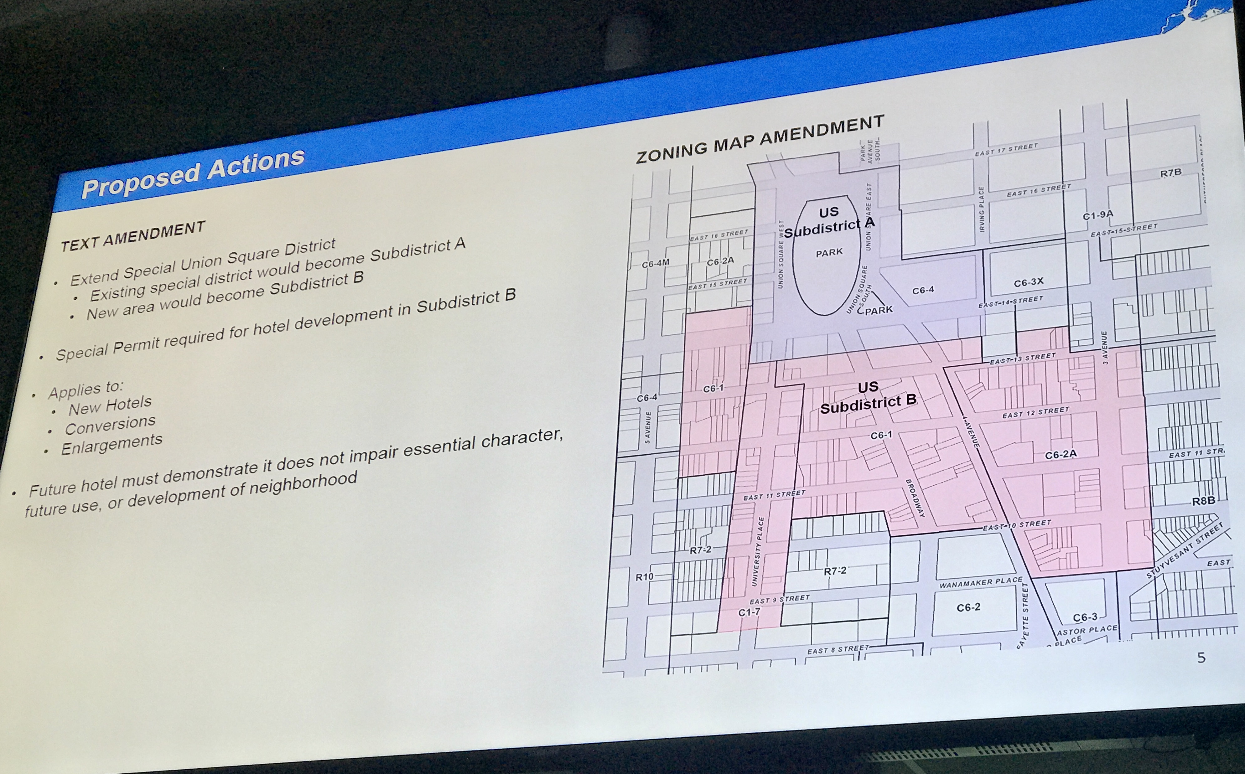 BY GABE HERMAN | The city’s proposed plan to require special permits for hotels below Union Square “misses the mark,” according to locals. The plan, which was was presented at a Community Board 2 meeting on Nov. 13, was met with criticism and skepticism from the committee and members of the public. The plan would require special permits for new hotels to be approved by both the City Planning Commission and City Council, between East Ninth Street to East 14th Street, and Third Avenue to Fifth Avenue. Matthew Pietrus, a city planner at the Department of City Planning (DCP) showed photos of the area and said it had a mixed-use character. Pietrus said in his presentation that because the area is relatively small and does not have much vacancy, “we don’t think there would be an undue increase in commercial development.”
