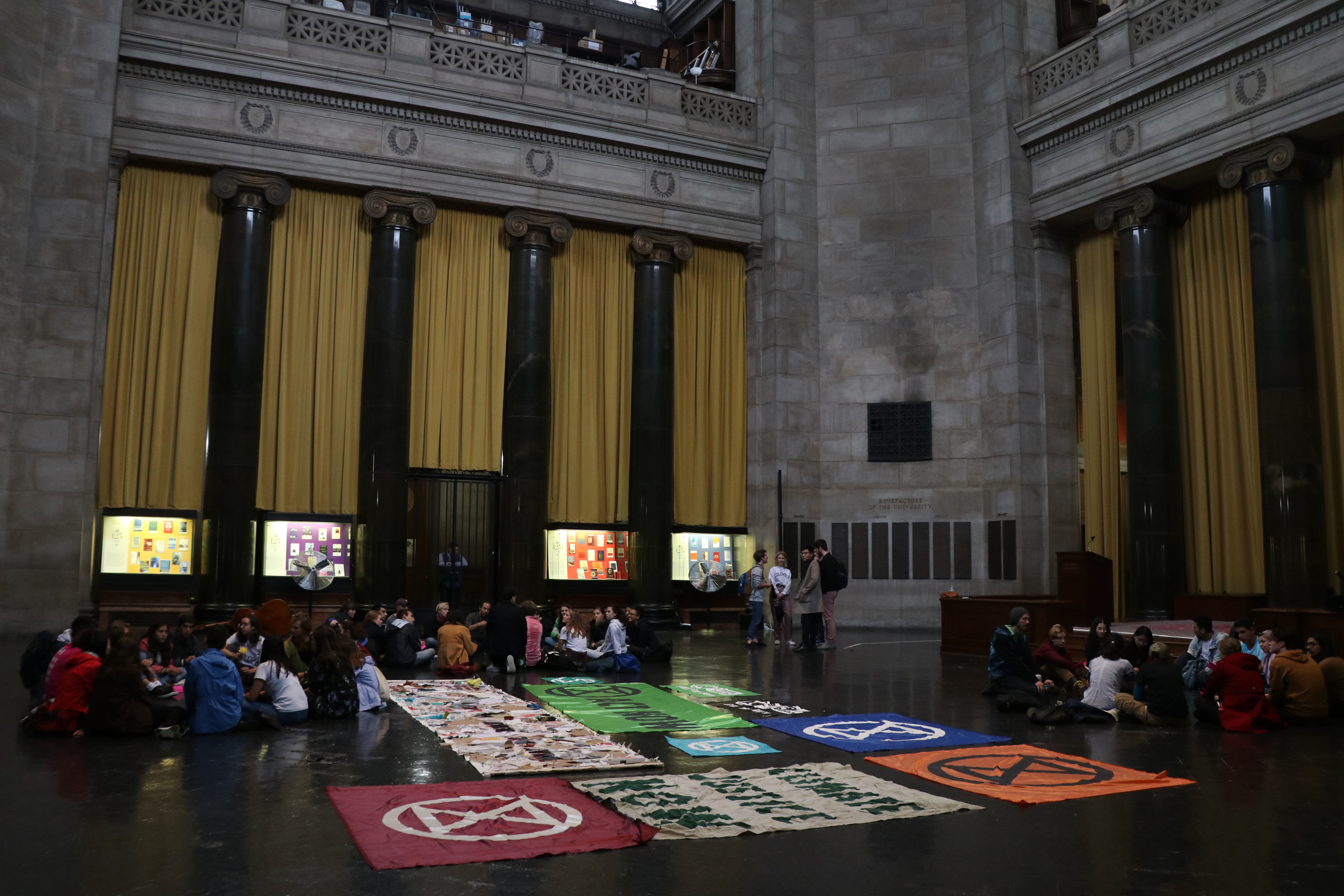 BY ALEJANDRA O’CONNELL-DOMENECH | Columbia University students stormed the school’s Low Memorial Library and staged a sit-in as part of an Extinction Rebellion protest on Wednesday. The protest was organized by the university’s chapter of Extinction Rebellion, the environmental group that uses non-violent civil disobedience to call for government action on climate change. Yesterday’s student-led protest was part of five days of demonstrations organized across the city. Protests started on Monday, when Extinction Rebellion protested outside of the New York Stock Exchange, where some members laid in pools of fake blood symbolizing the lives lost to the effects of climate change. “We will be present in the building for six days, six for the sixth mass extinction, six for the number of years we are giving this university to get to net zero greenhouse gases,” said Joshua Scott, 27, one of the founders of Columbia’s chapter of the environmental group. In September, Columbia University announced the creation of a task force to examine what more the institution could be doing in response to climate change. “While nations and the international community struggle even to begin to come to terms with this emerging reality, academic research institutions have been and are increasingly engaged, necessarily, with this subject,” reads the university’s online announcement of the task force’s creation. But students are not satisfied.