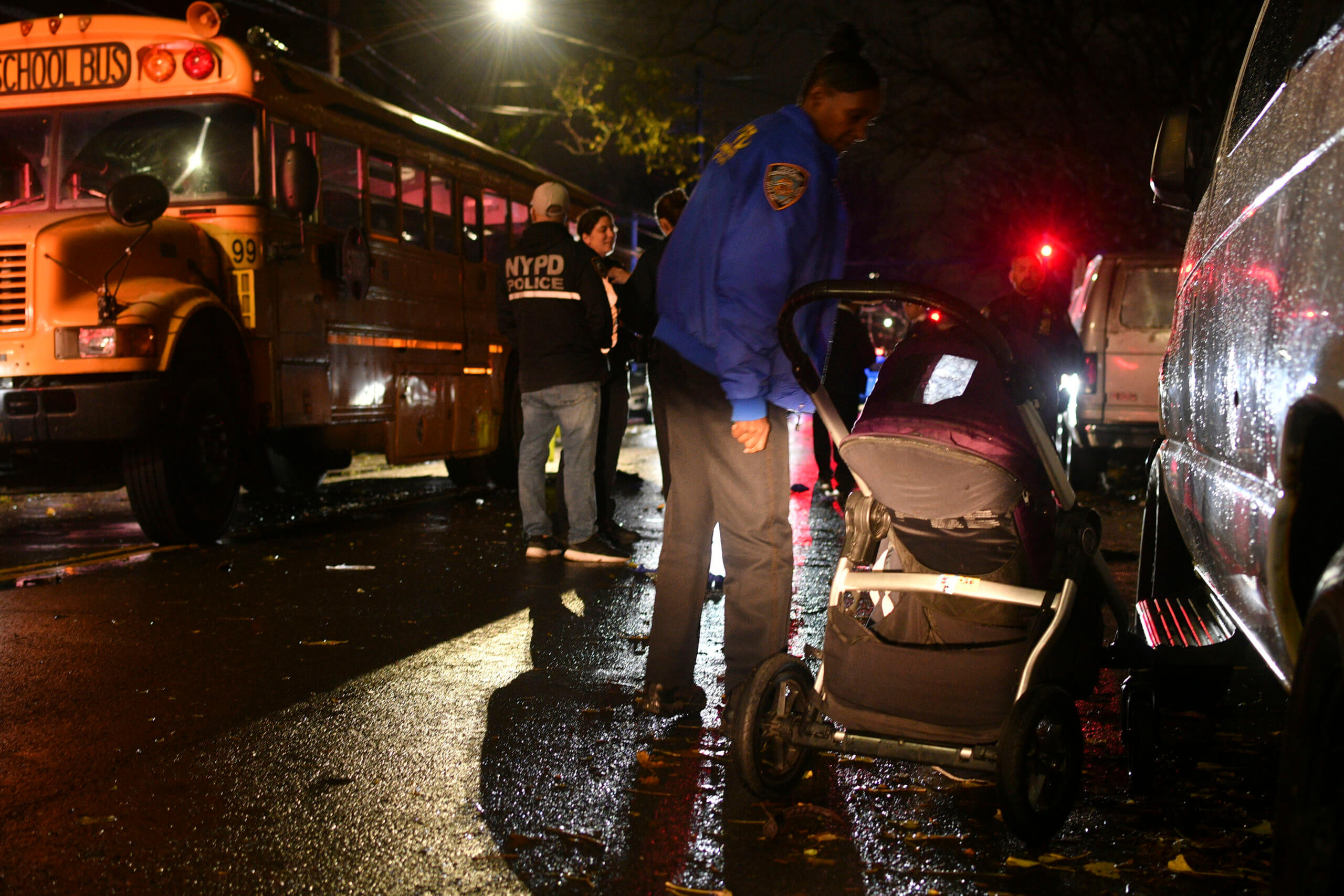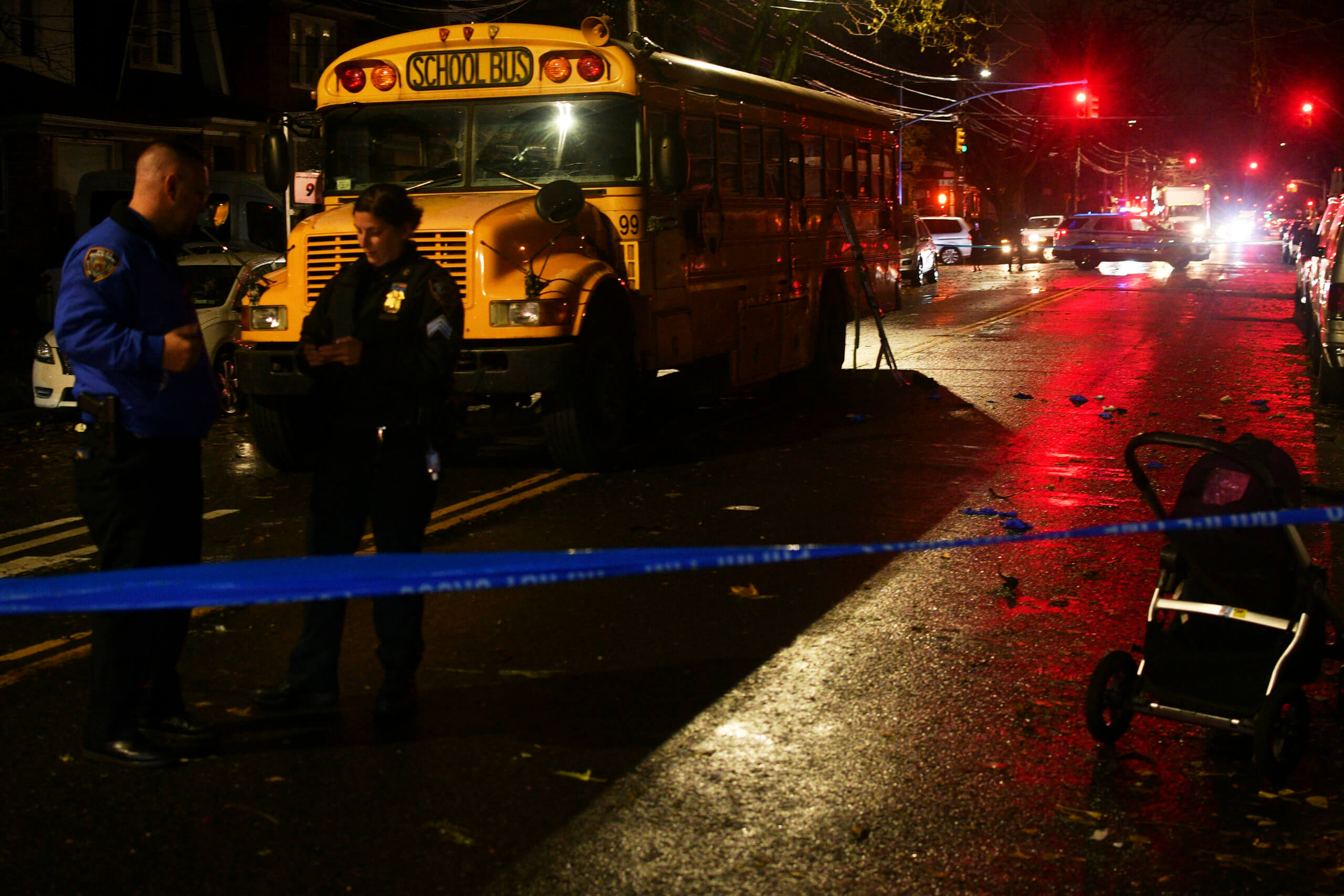 A spokesperson for the NYPD told reporters at the scene that officers were conducting a traffic stop on a 2016 Mercedes Benz when the driver sped off hitting a school bus and the victims. The driver of the Benz dumped the car at East 24 Street and Glenwood Road, where the car was later found unoccupied.