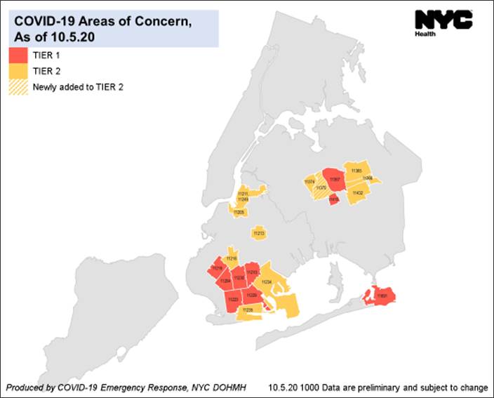 The Health Department data indicated slow yet spread of COVID-19 in two-thirds of the nine ZIP codes targeted for the “pause” plan. All nine areas have experienced more than 7 consecutive days of 3% positivity rates for COVID-19 tests — an indicator which led the de Blasio Administration on Sunday to take action.