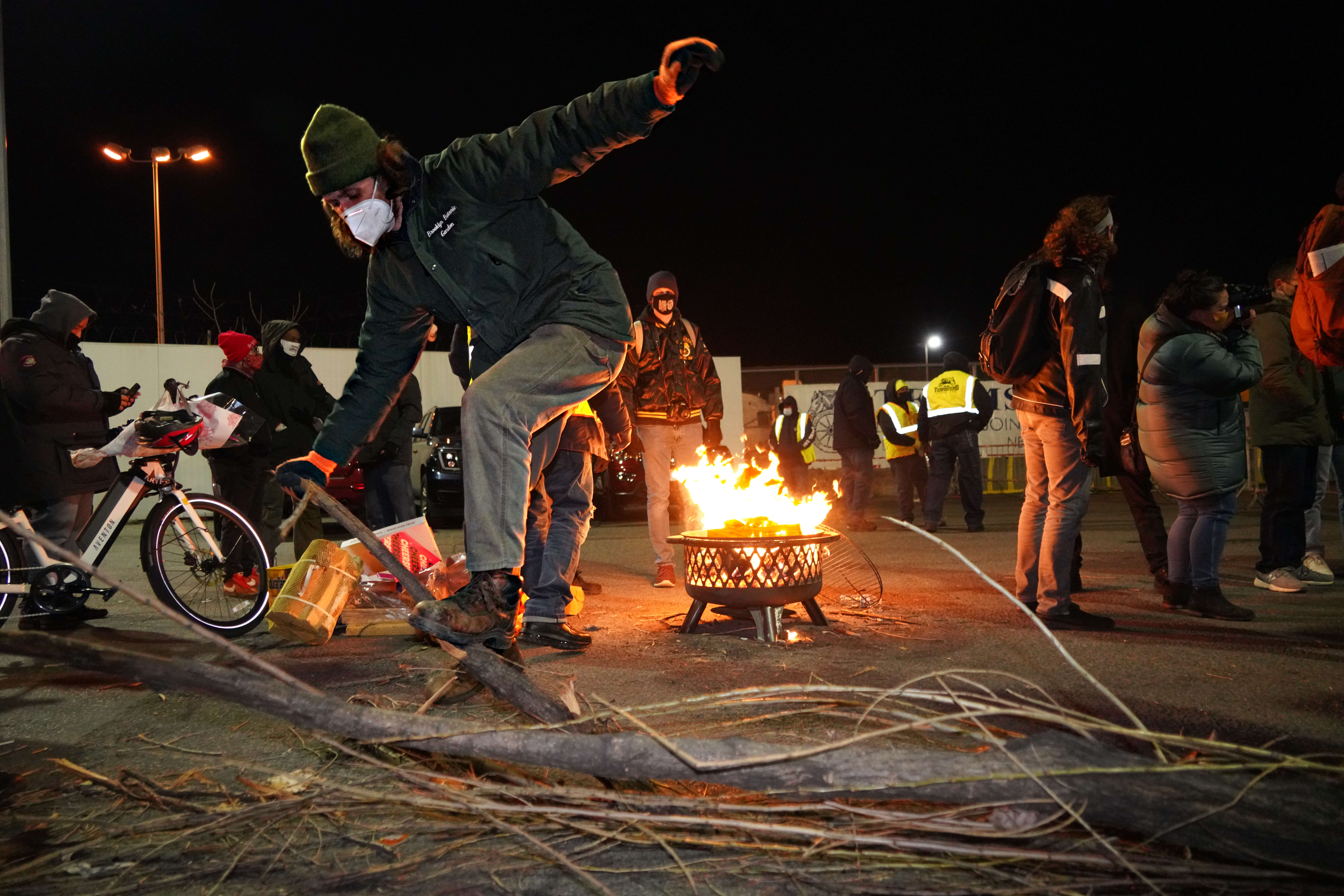 Since Dr. Martin Luther King Jr. Day, Jan. 18, hundreds of Hunts Point Market workers halted all labor after talks of an hourly wage increase deteriorated. Strikers have since camped in the area while awaiting the word of a pay increase. The members of Teamsters Local 202 keep warm amid the frigid temperatures by snapping tree branches and adding several blocks of wood to crude bonfires. Ash and sparks dance in the night air, prompting eyes to well with tears as they also attempt to maintain full bellies thanks to an onsite barbecue.