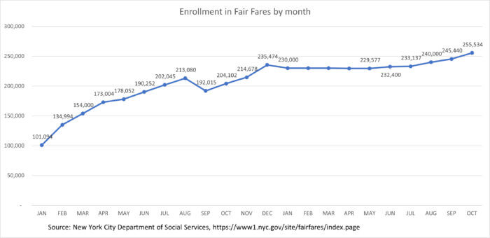 The enrollment number has declined again slightly to 248,455, according to the latest figures from Nov. 3 on the Fair Fares website.