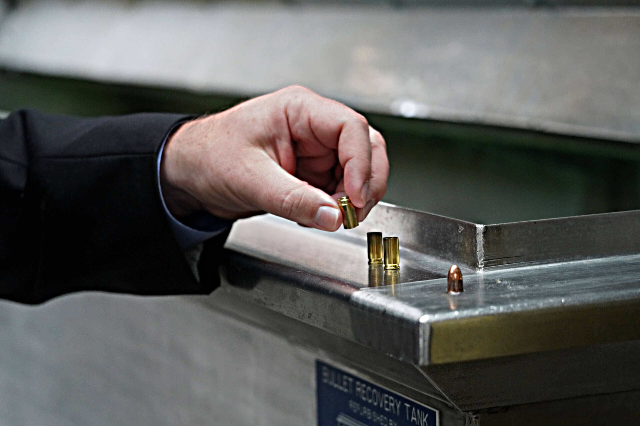 Placing a protective sheet over the gun to prevent backfire — something ghost guns have been known to do when ill assembled, Captain Strong fired several shots into the tank. Although ghost guns lack serial numbers, making them difficult to track, using this technique allows Strong to take both the casings and the bullets themselves to another part of the lab where they can possibly be traced to other crimes the guns may have been attached to.
