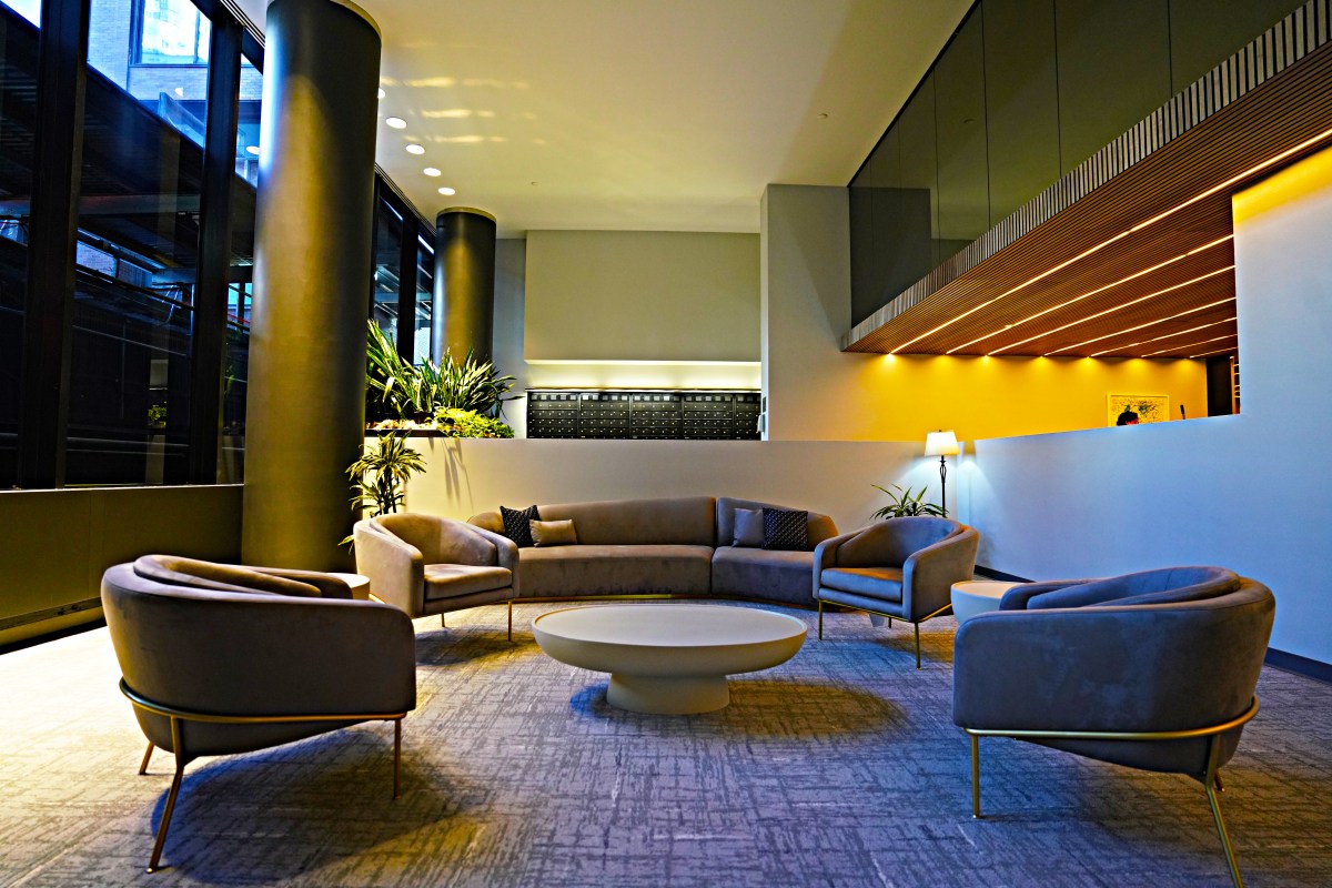 The newly refurbished lobby includes new, more comfortable furniture, enhanced lighting fixtures, and new modern artwork to give the lobby a fresher feel, more contemporary feel.