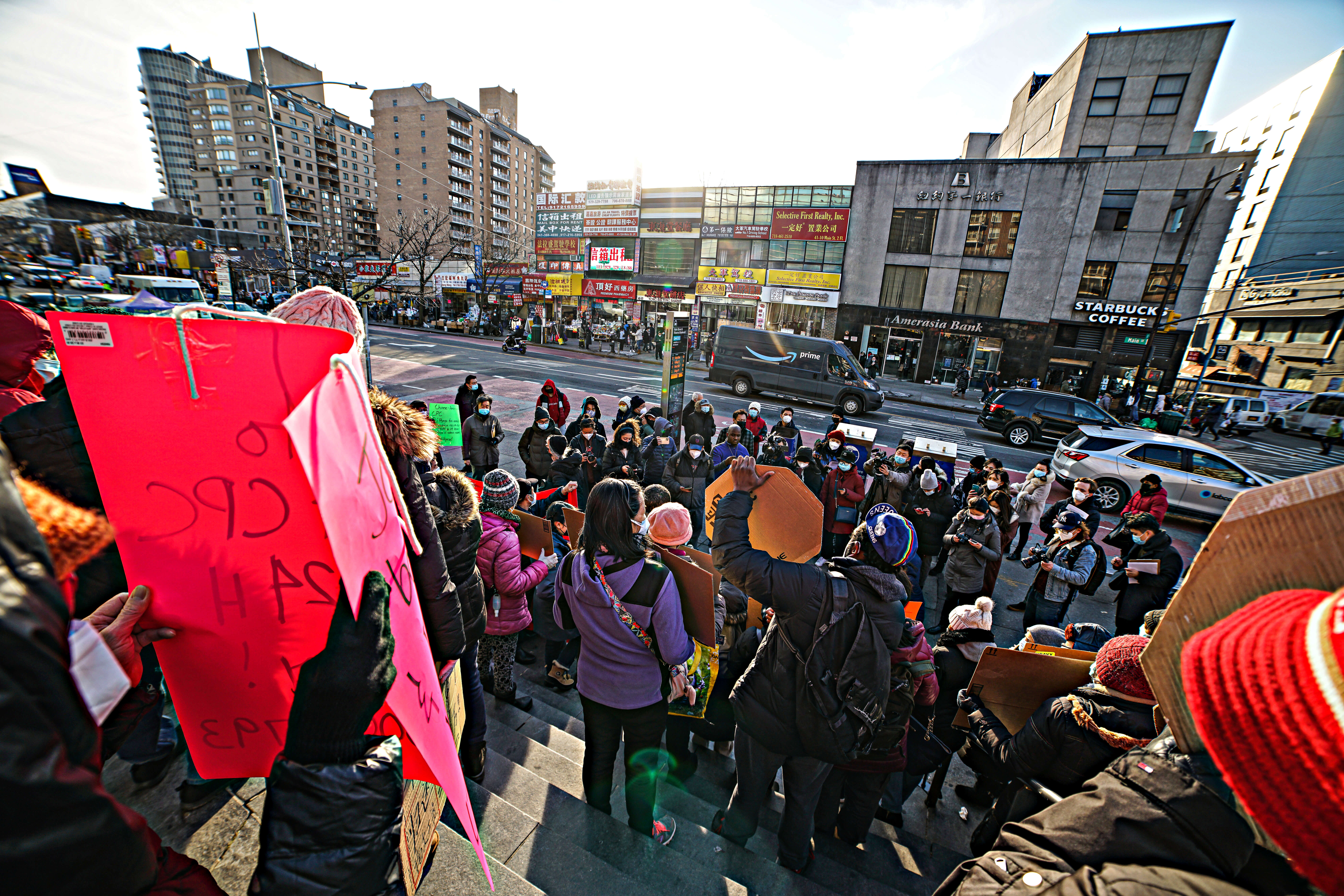 The steps leading to the Queens Public Library in Flushing were overflowing with protesters Wednesday demanding an end to the 24-hour workday and accountability from their employer, CPC — prompting a stern denial from the organization.