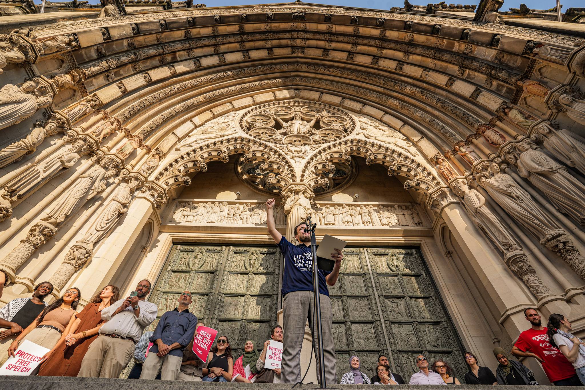 Mahmoud Khalil stood on the steps of the Cathedral of St. John the Divine on Sunday afternoon and told a crowd of hundreds about the long weeks he spent in ICE detention following his arrest on March 8.