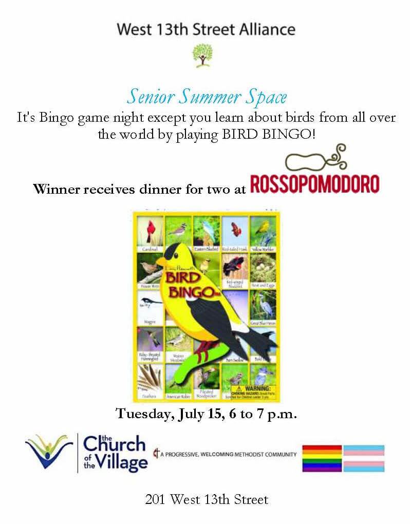 Bird Bingo: In collaboration with the Church of the Village, the W. 13th St. Alliance will offer bird-themed bingo. The winner gets a Neapolitan dinner for two at Rossopomodoro, at 118 Greenwich Ave. Tues., July 15, 5 p.m. to 6 p.m., at 201 W. 13th St. Free.