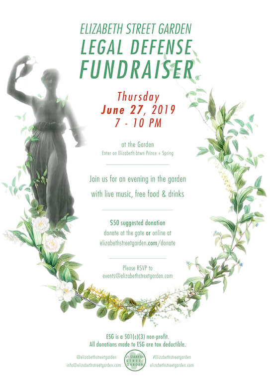 Garden defense: This Thursday, the Elizabeth St. Garden will be holding a fundraiser to support a legal team trying to protect and preserve the garden from development for city-sponsored housing project. The funds will also go toward supporting public programming and maintance for the garden. There will be live music, free food and beverages. $50 suggested donation. RSVP to events@elizabethstreetgarden.com.