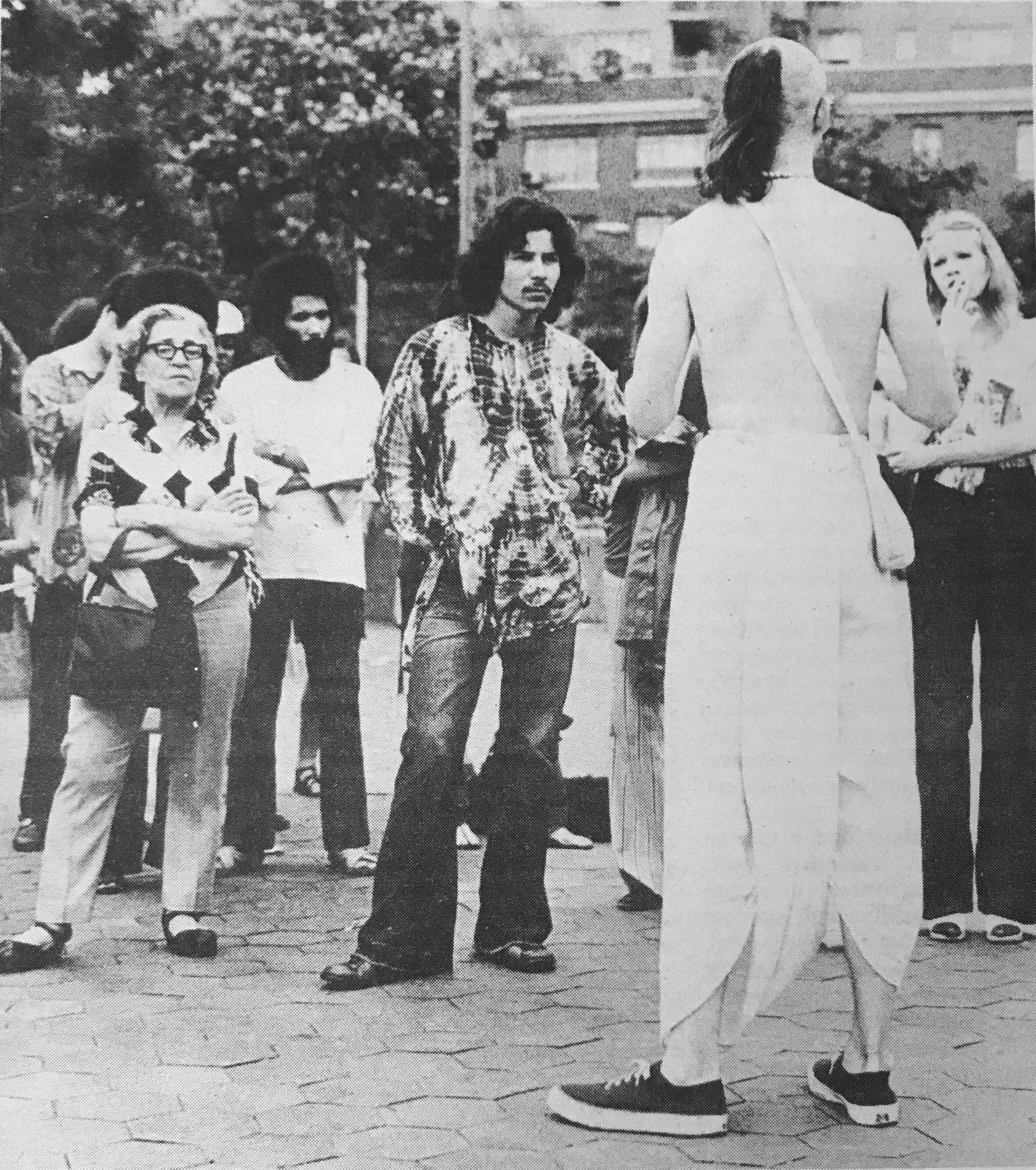 A photo in the May 18, 1972 issue of The Villager captured a Hare Krishna proselytizing to a crowd in Washington Square Park. The caption read: “An interesting study in faces was captured recently by photographer Fermin Benedetti who watched a Hare Krishna devotee explain his philosophy to group of Villagers in the park.”