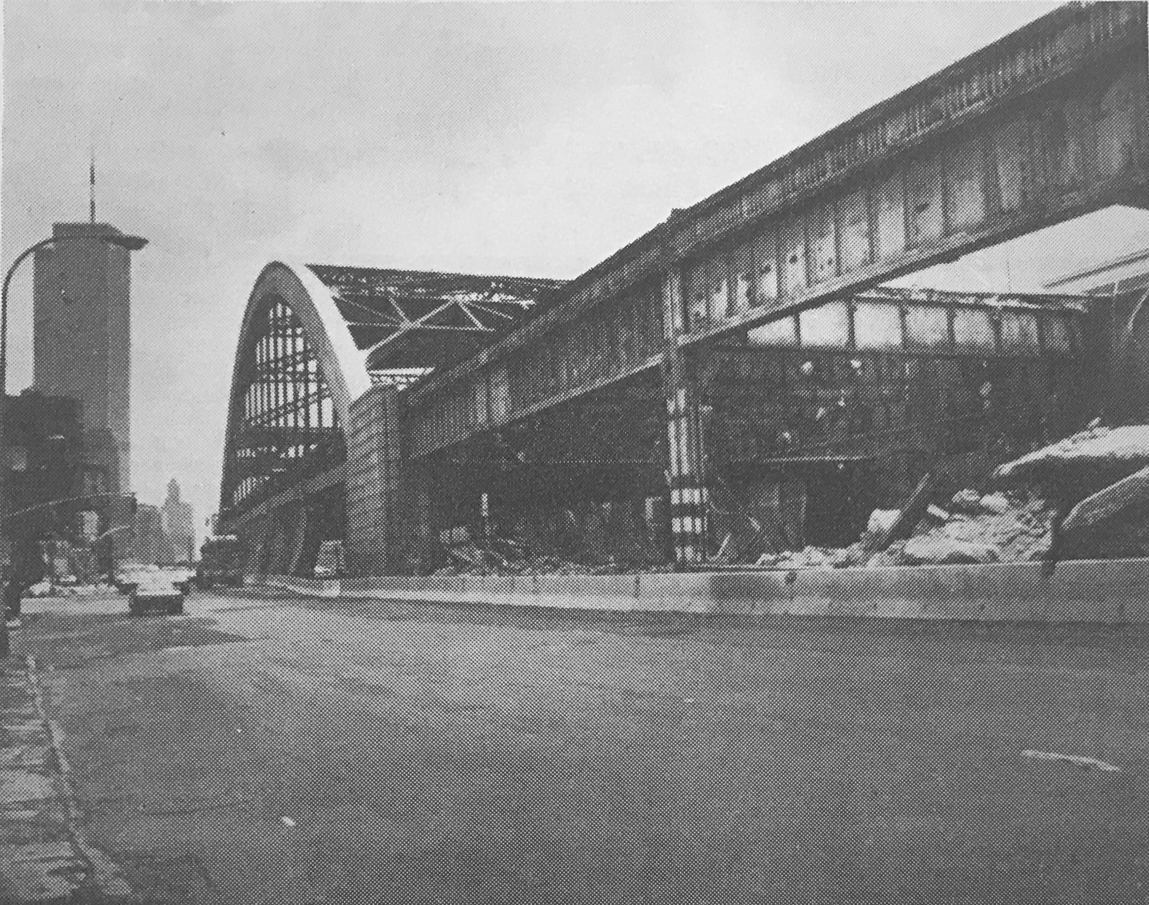 The June 10, 1982, issue of The Villager included this photo, showing remnants of the old West Side Elevated Highway. The viaduct had closed in 1973, the same year as the opening of the new World Trade Center, seen in the background, at left. The old highway was fully dismantled by 1989. It was replaced about 10 years later at street level by Route 9A. The steel arch seen in the photo was at West and Canal Sts. (Photo by Rena Cohen)