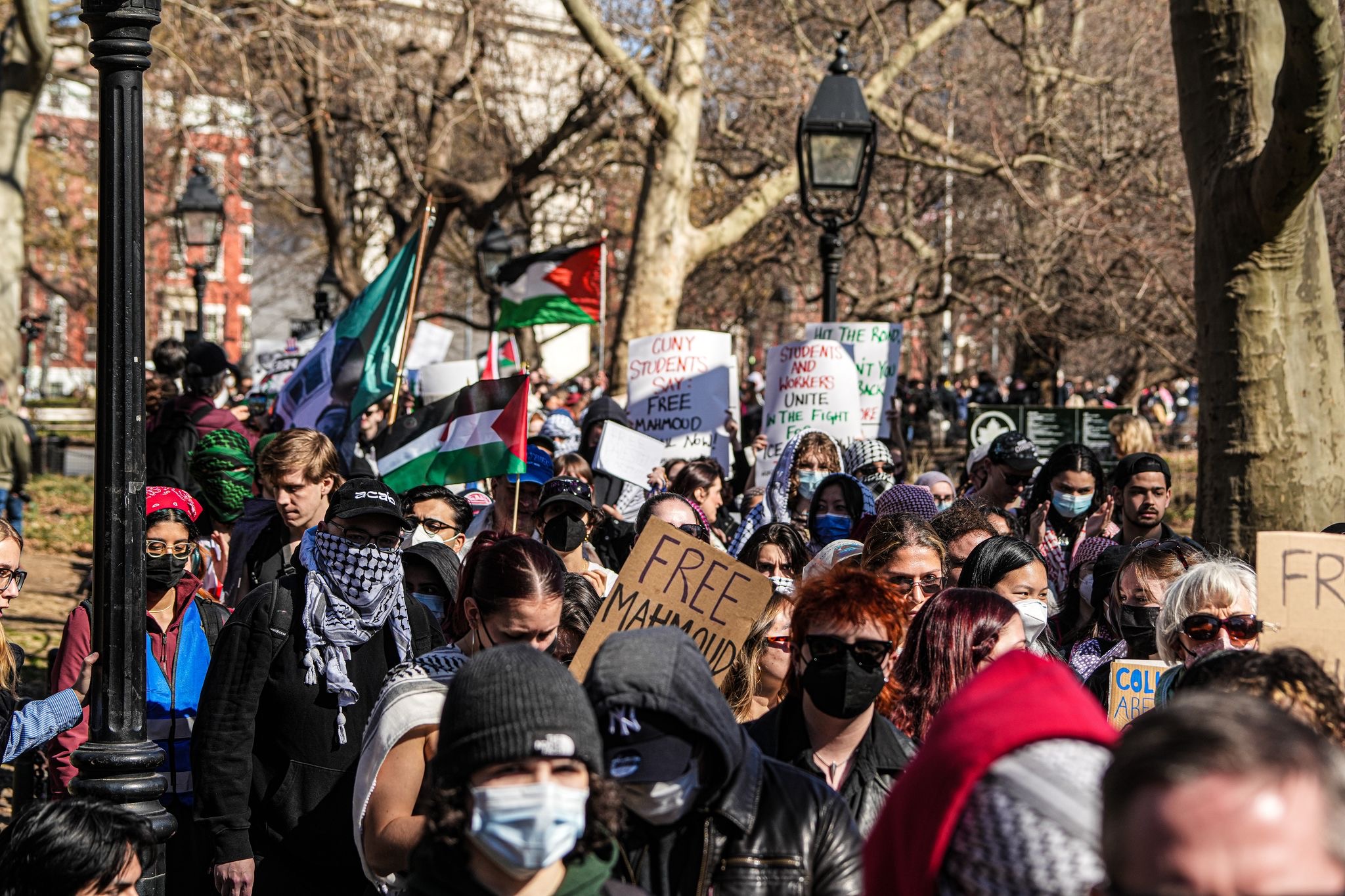 Later on Tuesday afternoon in Washington Square Park, several hundred also gathered to express outrage over Khalil’s detainment. For more than an hour, demonstrators chanted for Khalil’s freedom and took turns discussing their outrage with the growing crowd.
