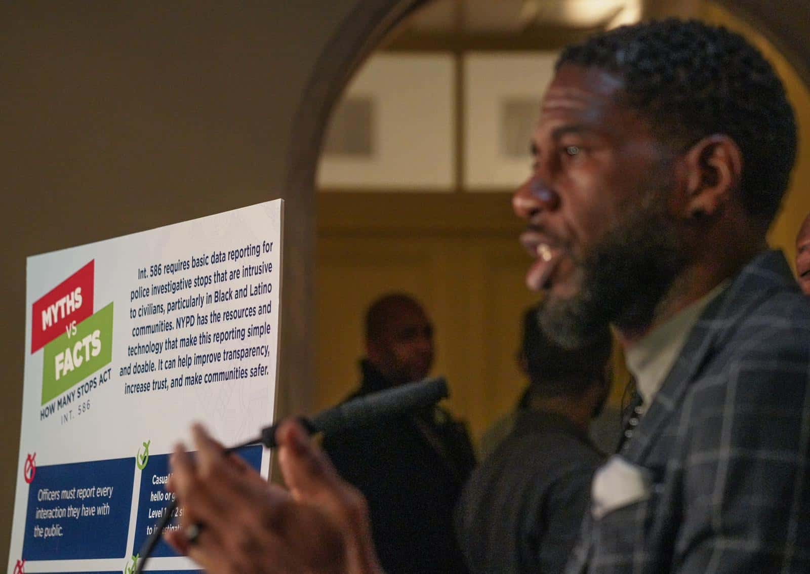 Council Speaker Adrienne Adams, Public Advocate Jumaane Williams and City Council members supporting the act — which would require NYPD officers to provide written reports on certain interactions with members of the public — staged the press conference at City Hall on Jan. 23. At first, the event was scheduled to be outside, but inclement weather forced the organizers to move the event indoors to the rotunda.