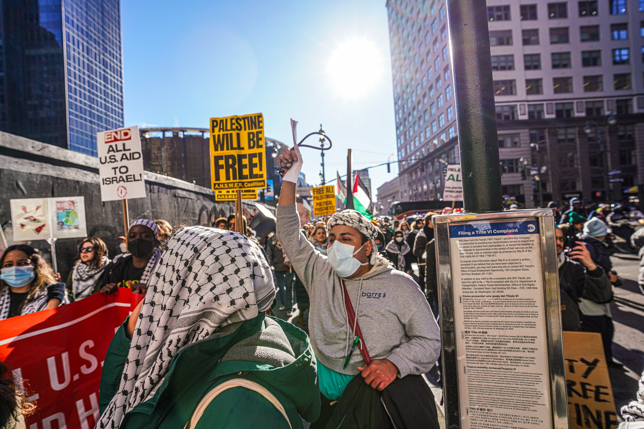 Nearly 1,000 protesters gathered on the steps of the New York Public Library in Bryant Park on Feb. 4 at around 12:30 p.m. Here attendees wearing masks, carrying signs, and waving flags told amNewYork Metro that they plan on marching until bombs stop falling in the Middle East.