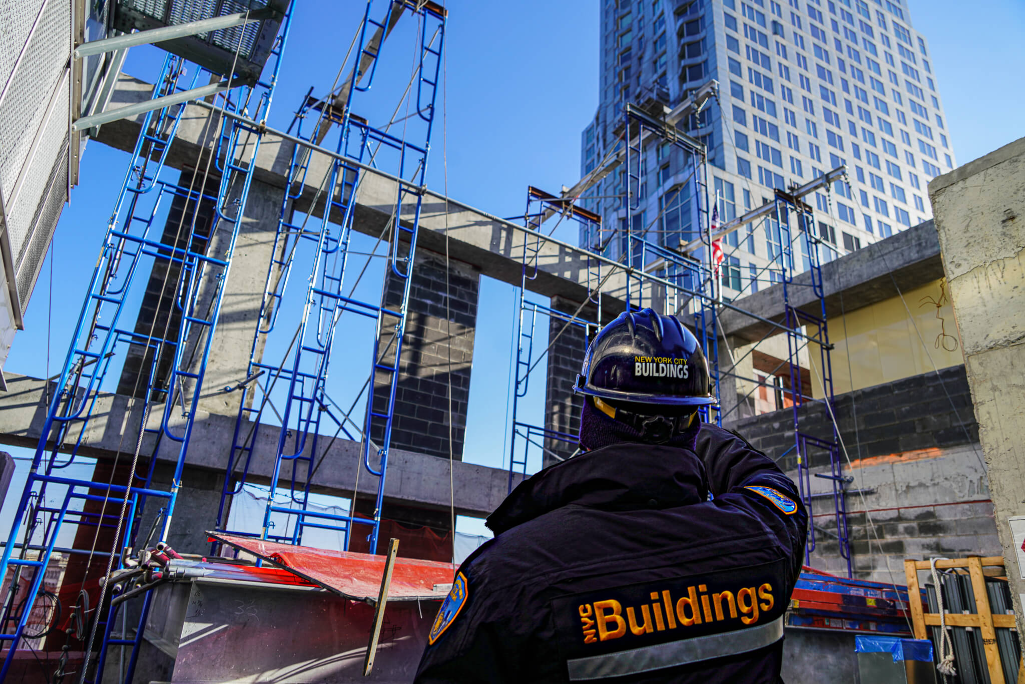 Led by Construction Inspector Joen Perez of the DOB Construction Safety Compliance unit, a small group of DOB agents began their inspection by visually examining the building from the outside before taking a hoist elevator to the top floor and beginning their sweep from above.