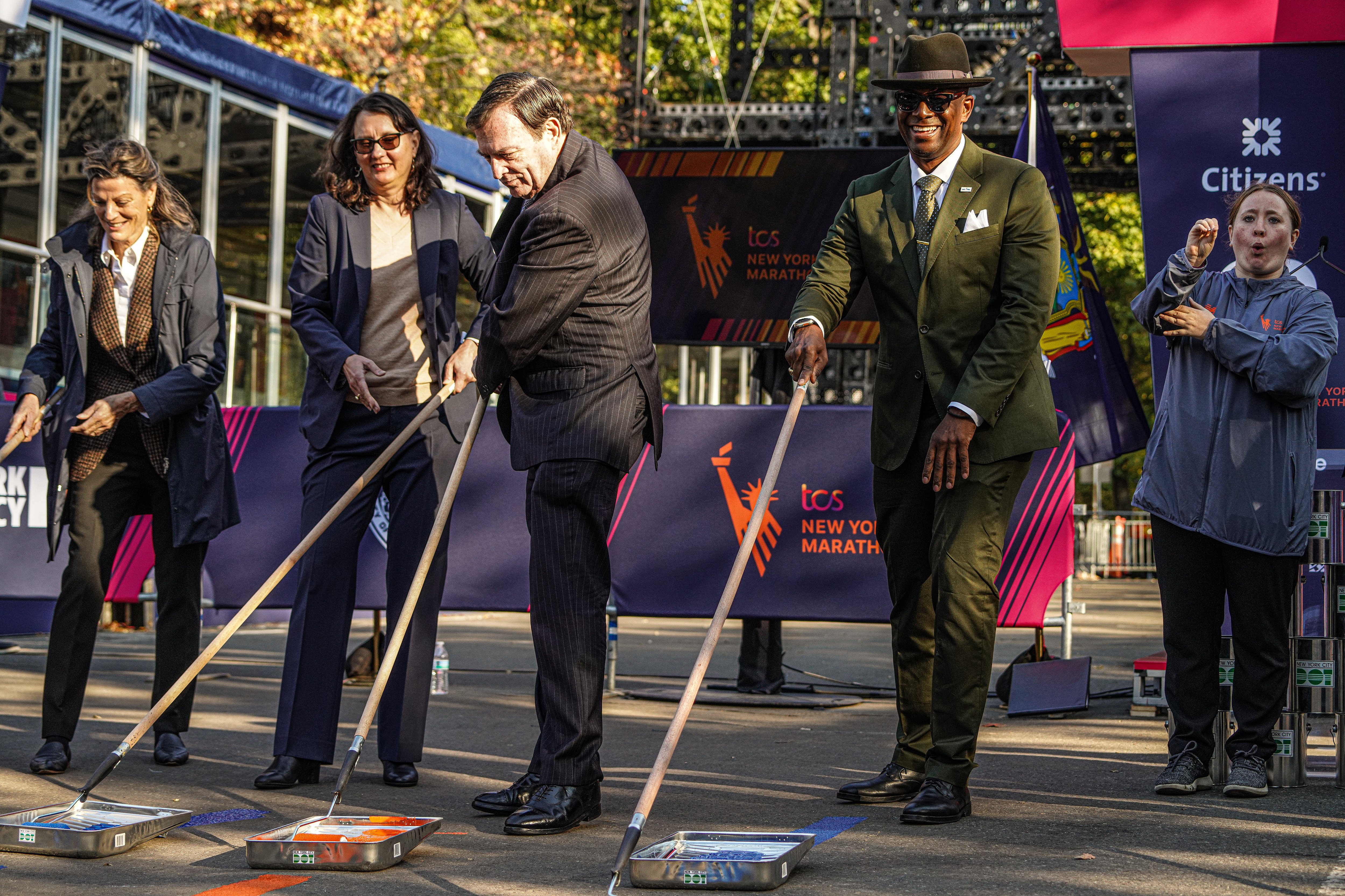 In honor of their journey, NYPD interim Police Commissioner Thomas Donlon, Fire Commissioner Robert Tucker, DOT Commissioner Ydanis Rodriguez, and more joined together to paint the blue line leading to the finish point near Tavern on the Green.