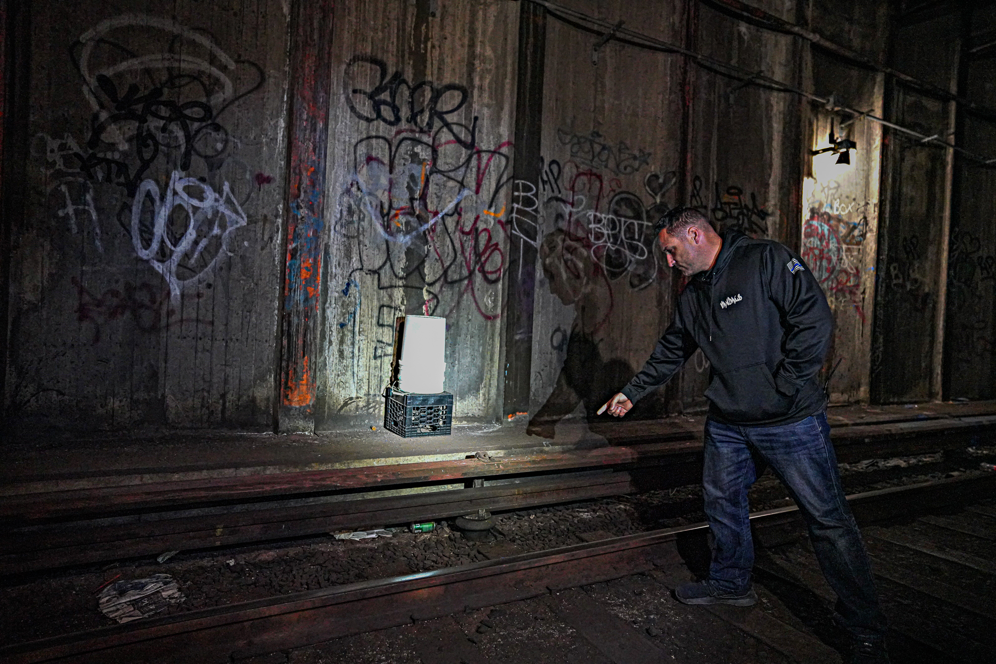 Following along the track in the dim, murky flashlight, the team came upon an array of strewn spray cans, splattered paint and rollers littering the roadbed. They then discovered a crate and tub balancing on one another just above the third rail.