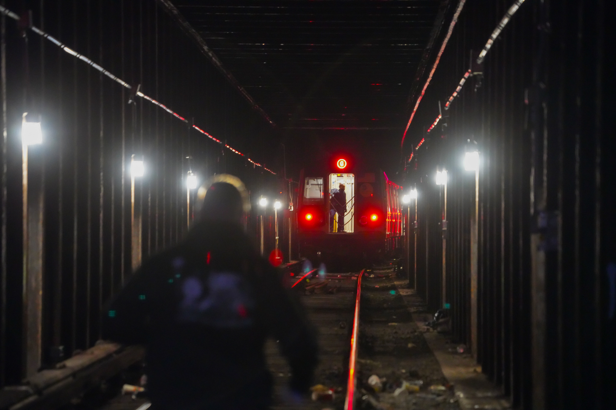 Then came a train rolling into the area — the unmistakable sound of the rumbling train car, the bright white headlights piercing through the darkness. Now, perhaps, is the most risky part of the officers’ jobs — getting the motorman’s attention, and getting out of the way, before it is too late.