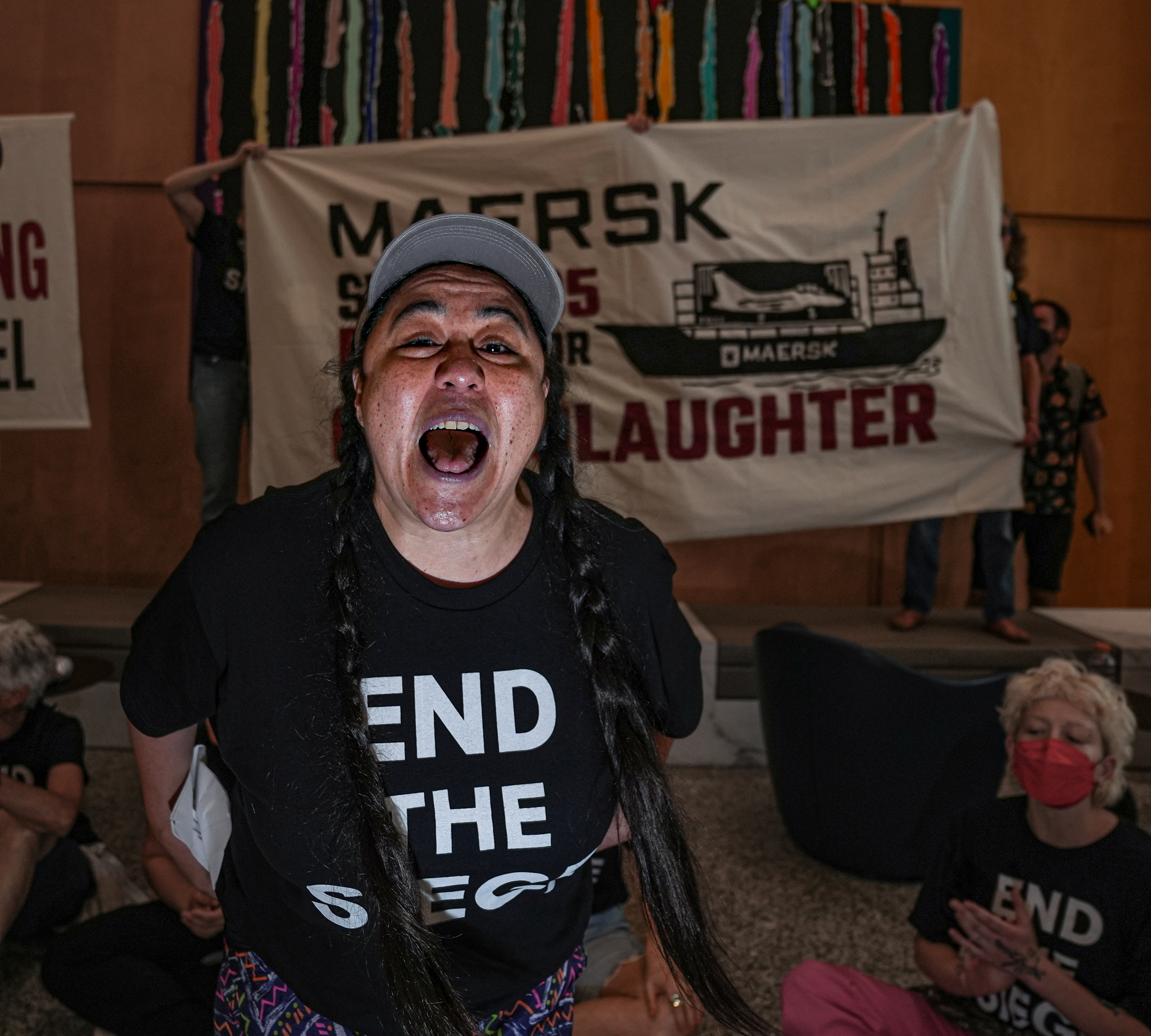 As they chanted “Maersk, Maersk, drop the cargo, we demand an arms embargo,” the demonstrators refused to move from the lobby until Maersk cut its Israeli military ties.