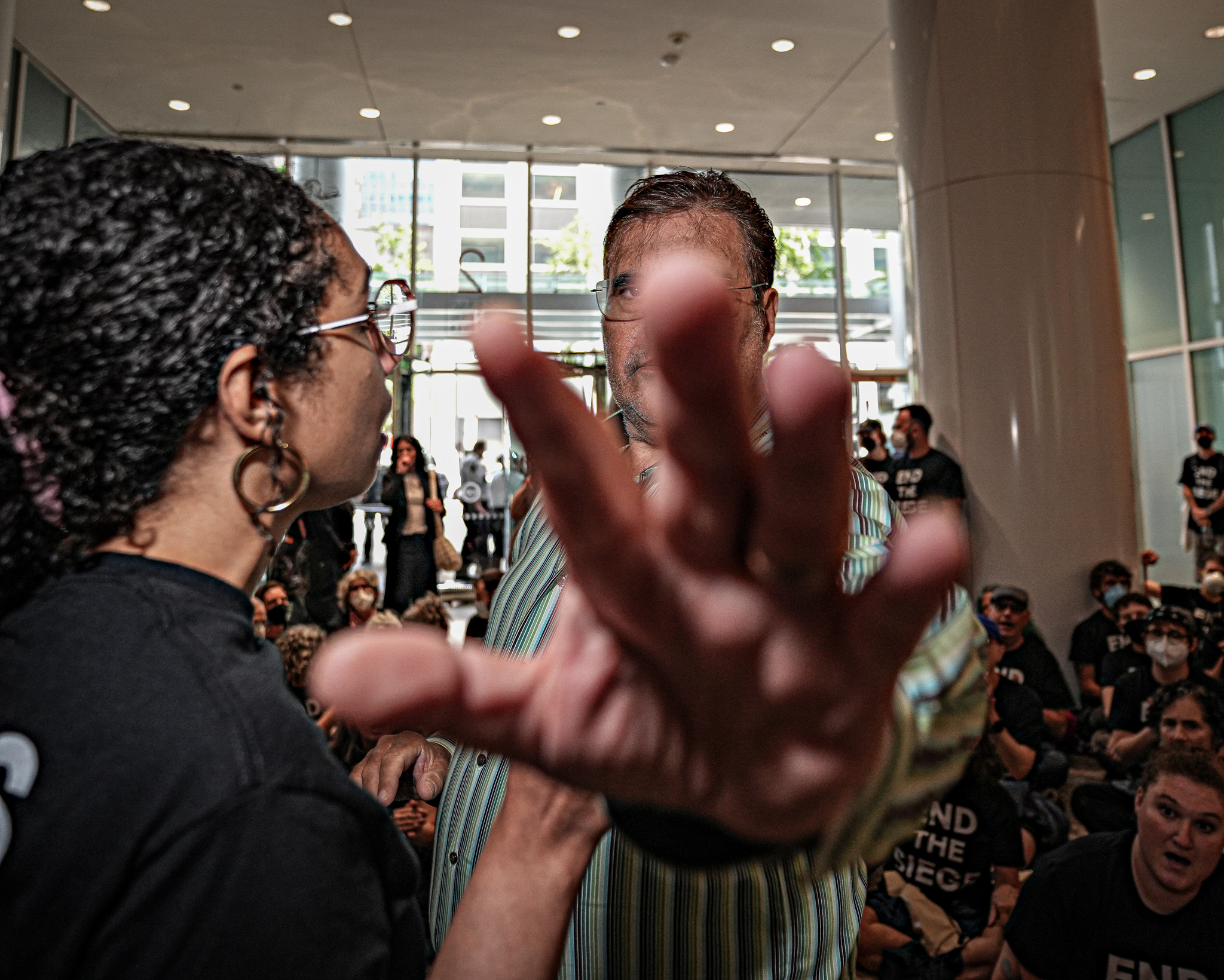 Workers in the building became enraged, pushing some protesters and even lunging at an amNewYork photographer.