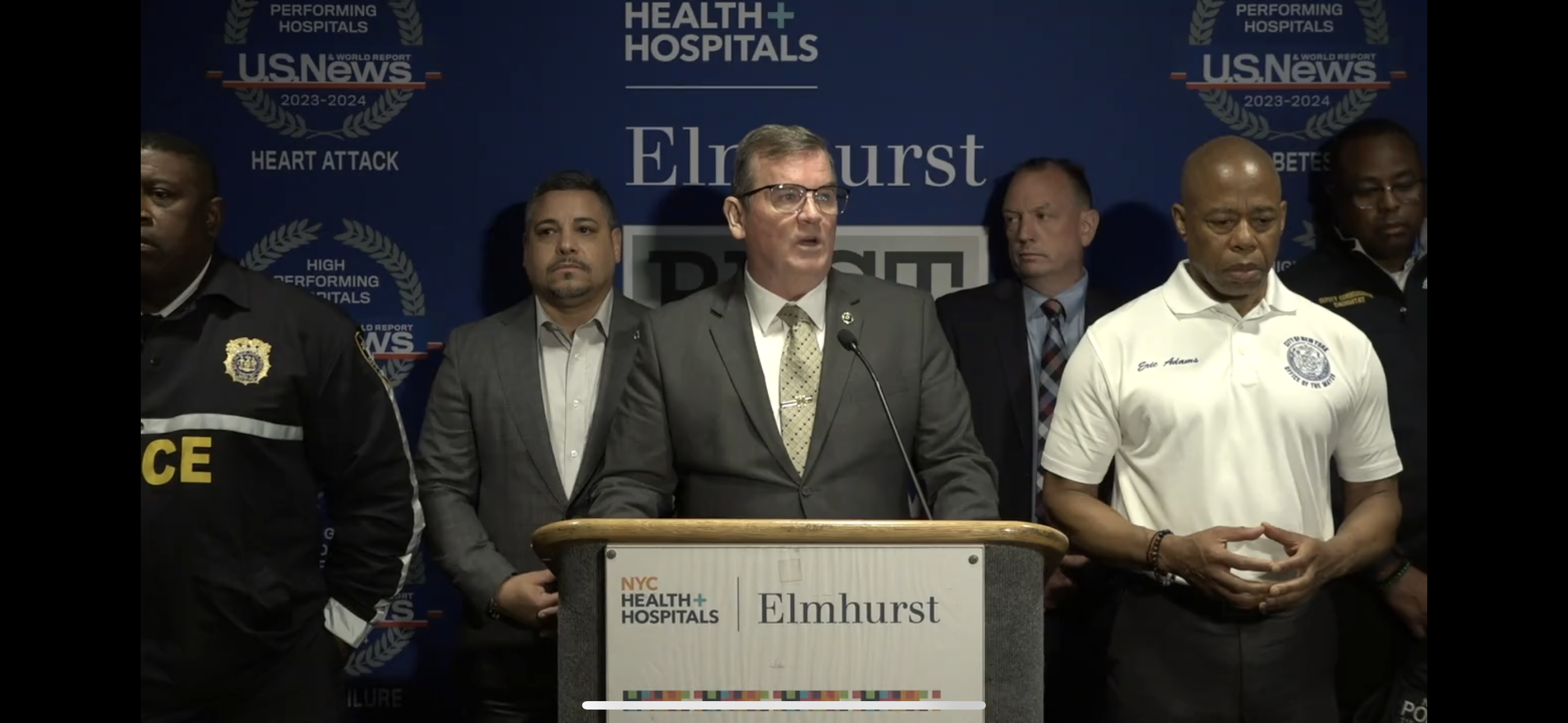 Mayor Eric Adams joined police brass at Elmhurst Hospital and lifted up the vest, showing where the bullet struck the cop. Adams solemnly condemned the attack on the NYPD, and counted the city’s blessings that both officers survived.