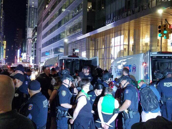 More were arrested later on as the mass of protesters still on scene remained in the roadway, twerking on buses, hopping on a flatbed, and singing “Empire State of Mind” with a pedicab driver. Some arrests were for disorderly conduct, others for unlawful assembly. All in all about two dozen demonstrators were loaded into the back of paddy wagons.