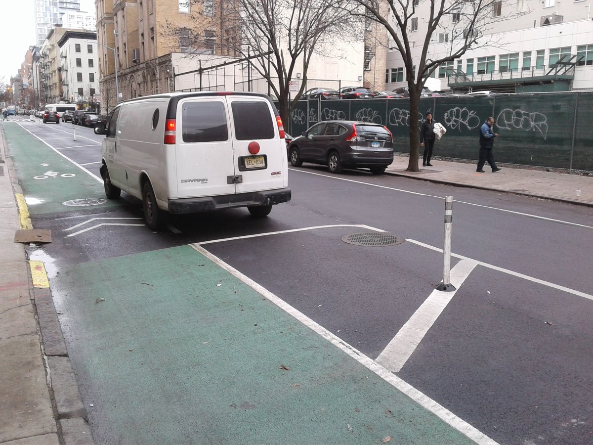 Schwartz also included as exhibits 50 photos he took showing vehicles blocking the bike lanes — plus one of a ladder blocking the bike path — as well as a “Mobile Heating Unit” truck parked on 12th St. near University Place and Broadway that was only recently finally moved out of the lane and into the buffer zone.