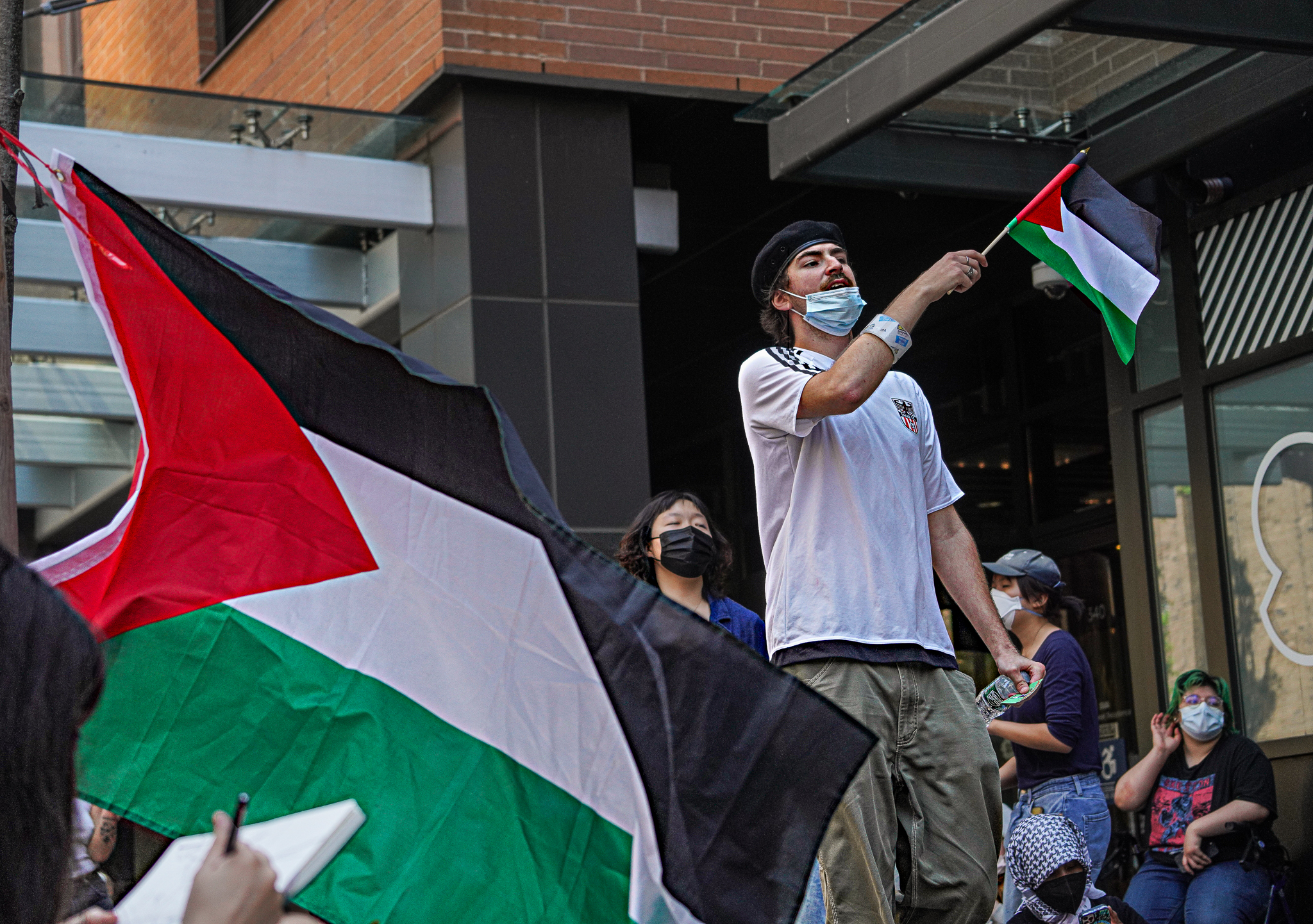Swiftly gathering, demonstrators marched in a circle in front of the school and taped signs reading “Free Palestine” to the buildings. They drummed on barrels and used chalk to write “Divest” on the sidewalk.
