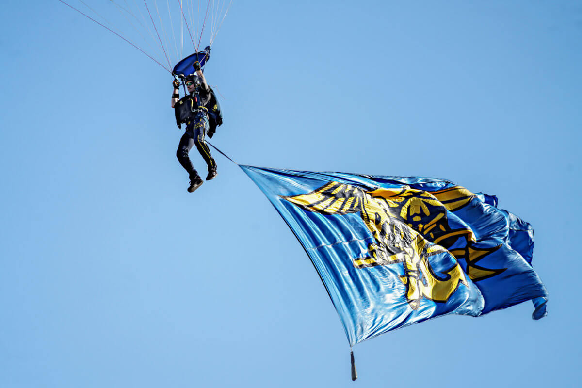 Hurtling through the air, the Leap Frogs performed breathtaking maneuvers with their parachutes deployed, including leaving smoke trails behind them, flying the Star-Spangled Banner in midair, and even joined together in the descent to show-off acrobatic moves.