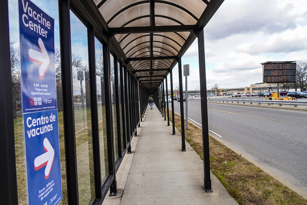 Whether patients are stepping off the A train platform or driving into the racetrack’s parking lot, it is hard to miss the splattering of posters pointing to the vaccine dispersal location at the Aqueduct. Drivers are directed to by members of the national guard to parking locations while those on foot can simply walk into the site.